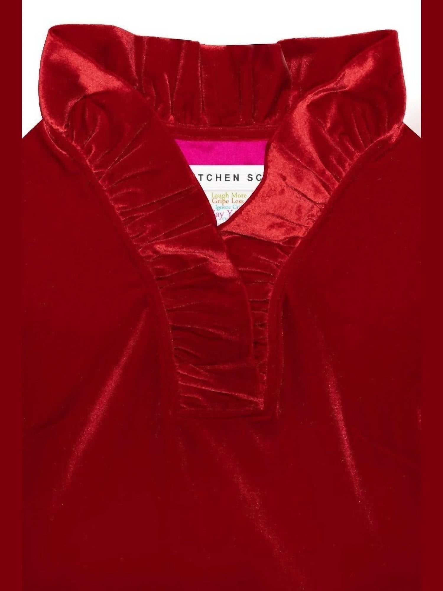 A timeless blouse that will never go out of style. Discover effortless elegance with the Ruffneck Top by Gretchen Scott in a striking Red Velvet hue. This solid blouse features a stand-up ruffle neck and three-quarter sleeves with contrasting turn-back cuffs for a chic touch. It is crafted from 92% polyester and 8% spandex, measuring 26 inches in length. Designed for easy wear, it has a pull-on closure and can be machine washed cold, with the option of a cool tumble dry or dry clean.