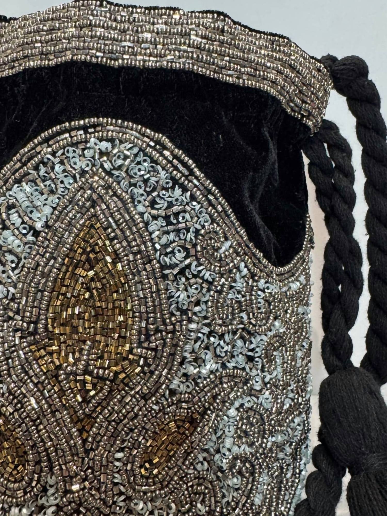 Lipstick, check. Mints, check. Credit card, check. The cutest little bag that holds all of your necessities. Elevate your evening look with the Women's Tory Pouch by Guadalupe Design, an exquisitely handcrafted black velvet bag. Featuring a soft drawstring closure and luxurious braided cord straps with tassel accents, this pouch blends vintage glamour with modern elegance. Its intricate gold and silver beadwork adds instant sophistication, making it perfect for special occasions. As both a statement accessory and a functional clutch, it's ideal for adding a touch of elegance to any outfit.