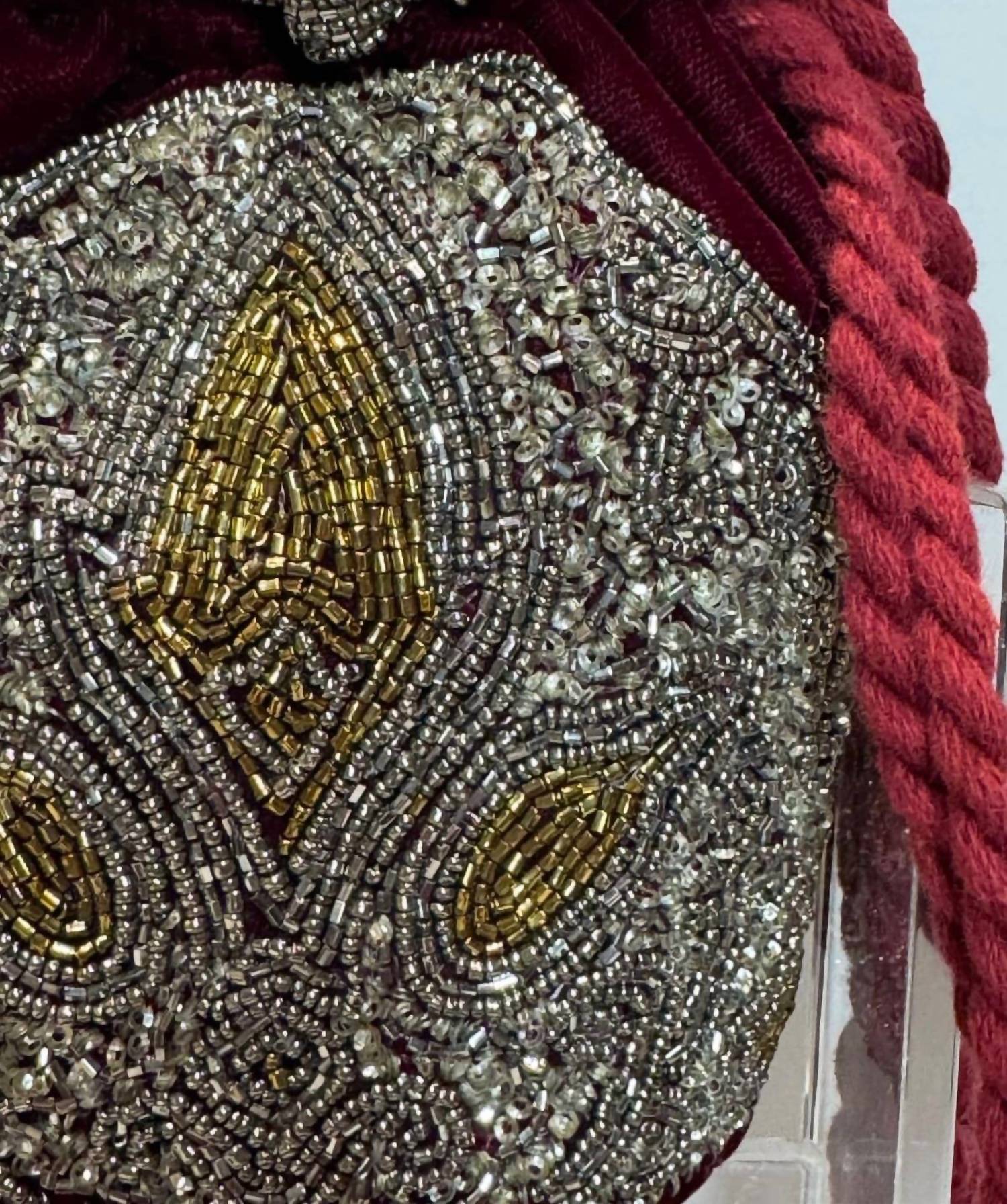 Lipstick, check. Mints, check. Credit card, check. The cutest little bag that holds all of your necessities. Introducing the Women's Tory Pouch by Guadalupe Design, a luxurious addition to your evening ensemble. This exquisitely handcrafted velvet clutch in striking red is adorned with intricate gold and silver beadwork. Featuring a soft drawstring closure complemented by braided cord straps with tassel accents, it beautifully combines vintage glamour with modern elegance. Ideal for special occasions, this pouch effortlessly elevates any outfit with sophisticated charm.