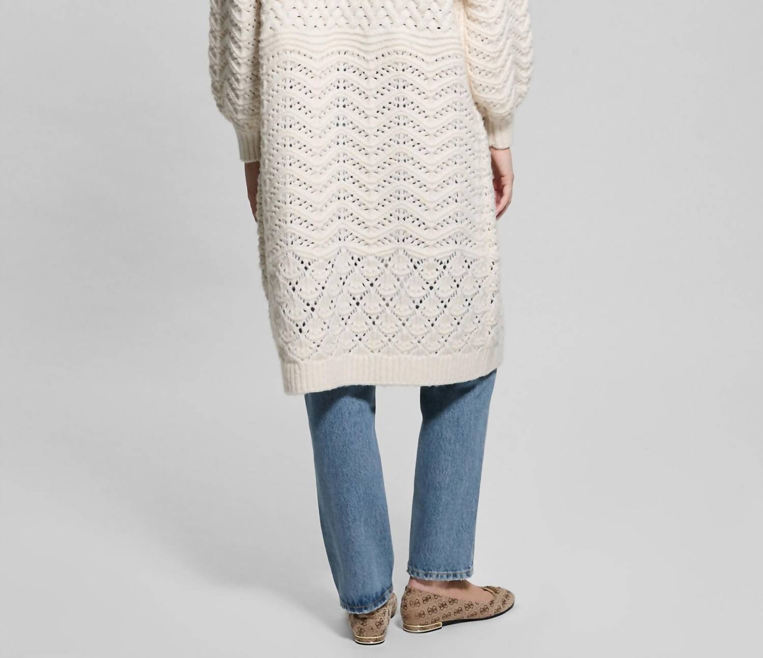 This cardigan will be a sweater-rotation favorite. The Valeria Mixed-stitch Long Cardigan by Guess is a chic addition to your fall wardrobe, offering both style and sustainability. This white, long-sleeve cardigan features a textured mixed-stitched design and longline fit, perfect for travel and minimalist trends. Crafted from a wool-blend composition of 62% recycled polyester, 29% acrylic, 5% nylon, and 4% wool, it includes ribbed trim and a convenient open front. For best care, hand wash and lay flat to dry.