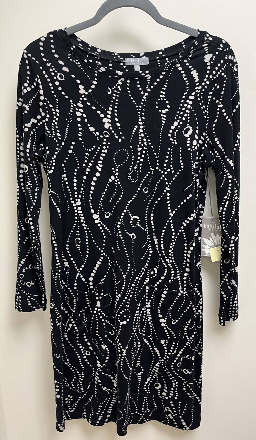 A short and breezy dress for those warmer days. Introducing the Cozy Rib Wavy Dots Artist Dress by Habitat, an elegant shift silhouette designed for both style and comfort. This mini dress features three-quarter sleeves and a scoop neckline, enhanced with textured wavy dots for a sophisticated look. Perfect for a New Year's Eve dinner party, this black dress can be effortlessly styled for any occasion, embodying the trend of quiet luxury. With pockets for added practicality, it's a must-have piece for any season.