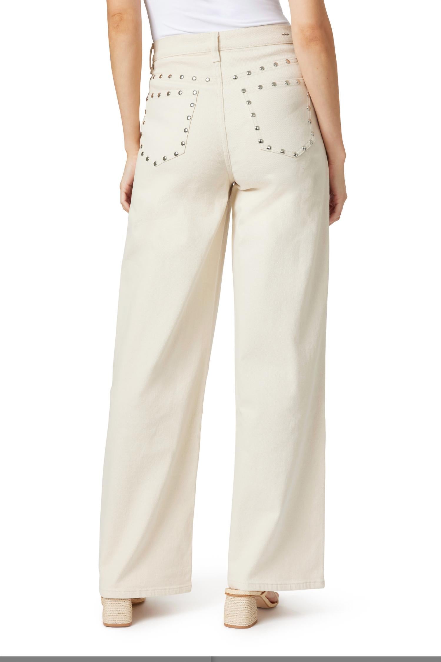 Introducing the Wide Leg Slouch Jean With Studs by Habitual, crafted in a chic ecru color perfect for spring travel. Designed with a relaxed fit and wide leg style, these patterned jeans feature a practical button closure and include pockets for everyday convenience. Ideal for adding a touch of flair to your wardrobe, they effortlessly combine comfort and style.