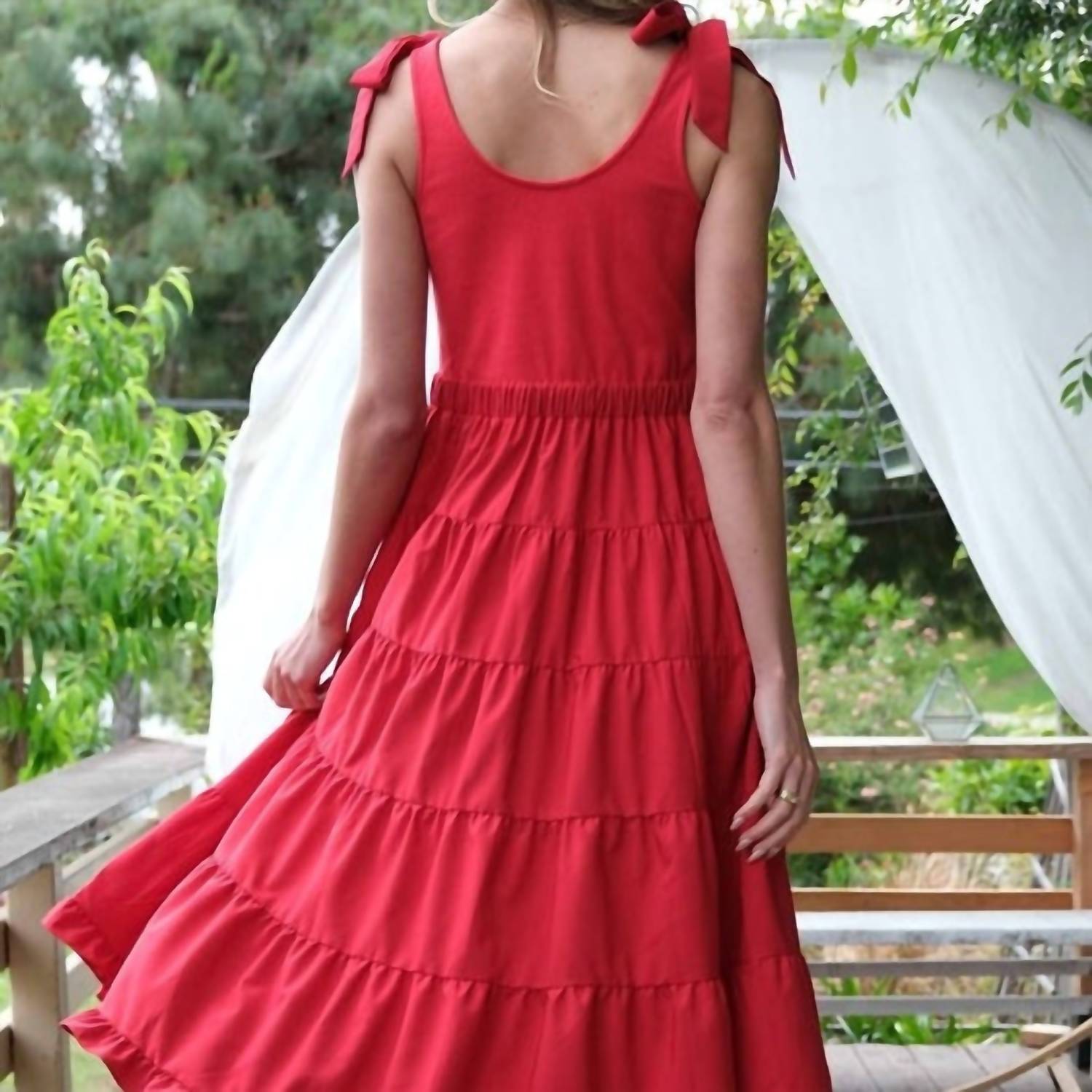 Style this maxi with your favorite statement necklace and sandals for the perfect look. Elevate your summer wardrobe with the Hailey & Co Shoulder Tie Tiered Maxi Dress in a striking red. This sleeveless dress is crafted from 96% polyester and 4% spandex for a lightweight and breathable feel, featuring a flowing maxi length and elegant A-line silhouette. Complete with adjustable shoulder tie closures and a relaxed tank-style bodice, this dress promises both comfort and versatility. Perfect for a garden party or vacation, it is machine washable, making it an effortlessly stylish and low-maintenance choice.