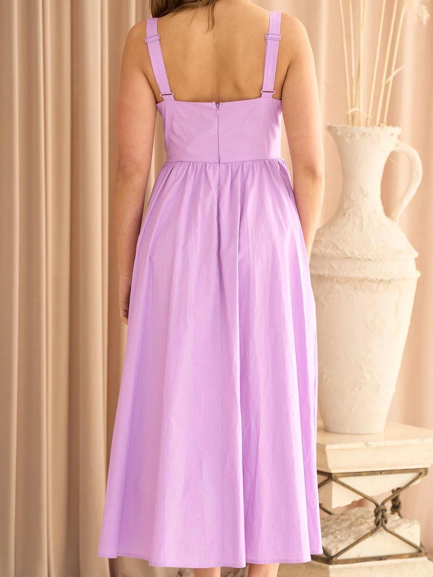 The perfect length dress does exist. Introducing the Stardust Sweetheart Dress by Hailey & Co in a captivating lavender tone, perfect for any evening event this spring. This sleeveless midi dress flaunts a minimalist A-line silhouette with adjustable straps and a scalloped sweetheart neckline. Crafted from 100% polyester with a 100% rayon lining, it ensures comfort without compromising on elegance. Closure: Convenient zip closure. Care: Machine wash for effortless maintenance.