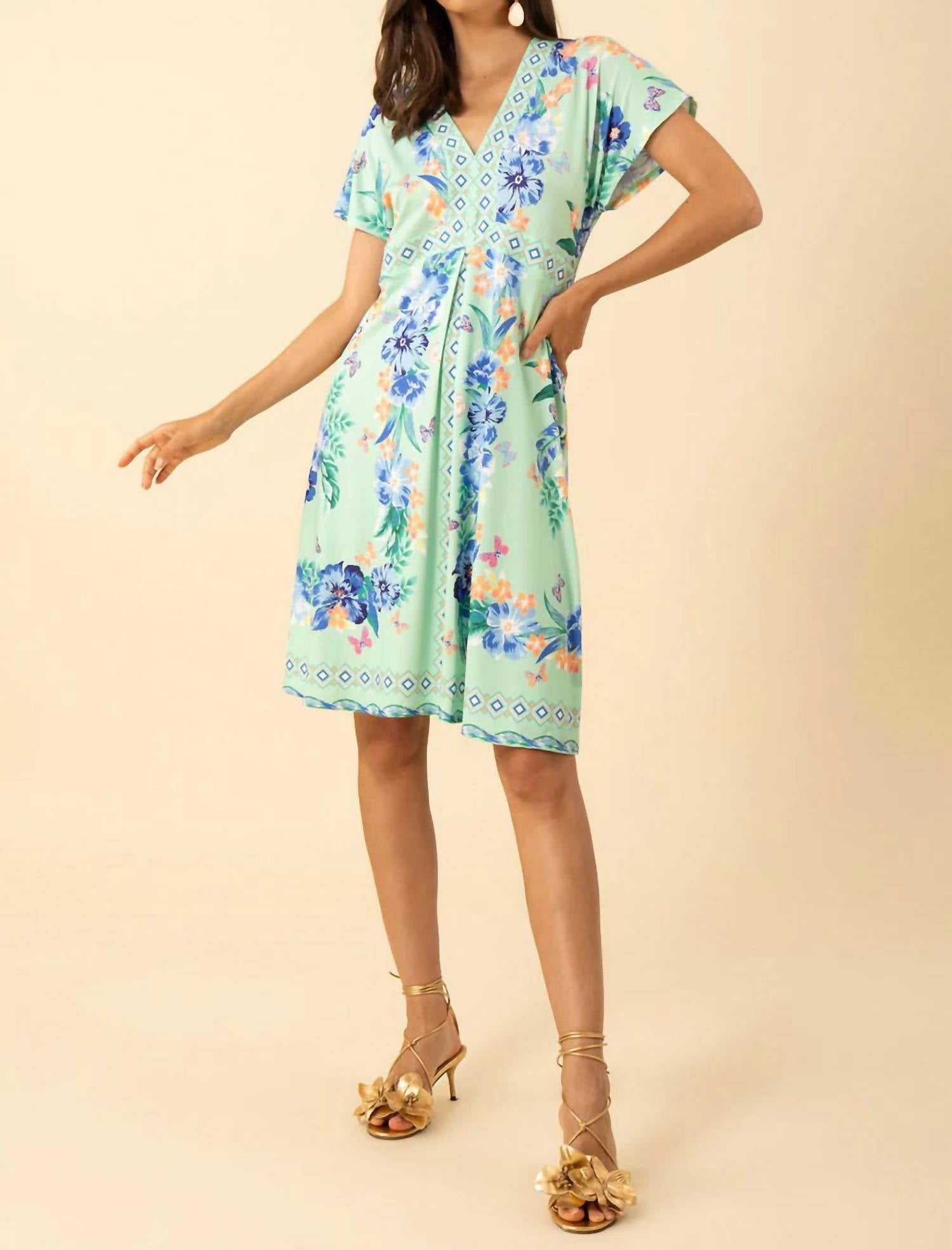 The perfect length dress does exist. Introducing the Hale Bob Bridget Jersey Dress, a summer essential in a vibrant mint green with a floral pattern. This dress features short flutter sleeves and is crafted from a comfortable nylon blend, with the composition of the lining being 96% polyester and 4% spandex, and the dress itself being 92% nylon and 8% spandex. The knee-length silhouette, measuring 41 inches, is complemented by a V-neckline and a unique tie closure, creating a relaxed yet elegant fit. For care, turn the garment inside out before washing, and opt for either a gentle hand wash or a cold delicate cycle, then tumble dry low and cool iron on reverse side if needed.