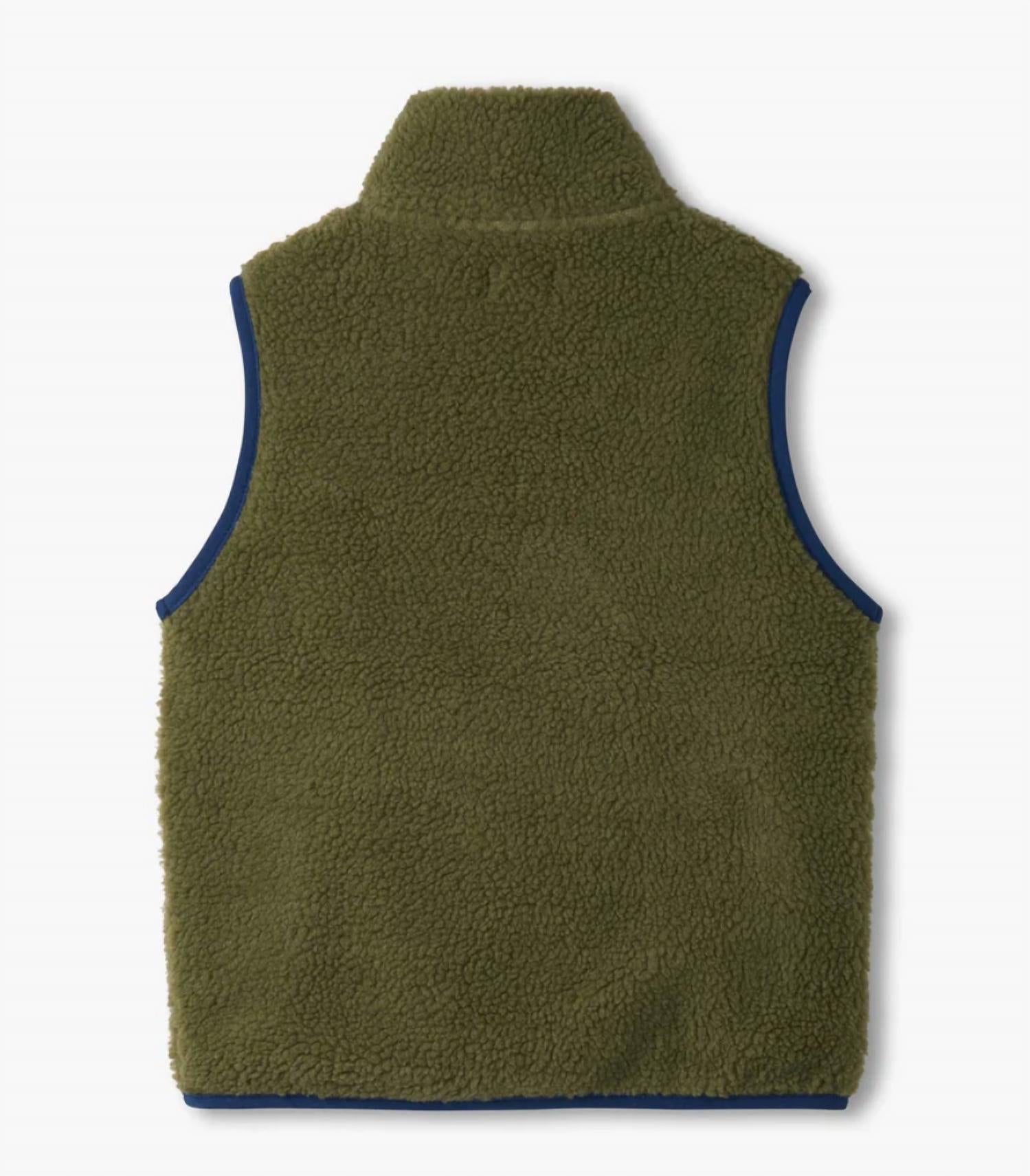 Wrap your little ones in comfort and style with the Boys Loden Green Faux Sherpa Vest by Hatley, perfect for back-to-school fall occasions. This sleeveless, textured vest is crafted from a soft faux sherpa shell with a full cotton jersey lining, offering warmth and breathability. It features a sleek zip closure accented by a black zipper and orange pull tag, complemented by dark blue welt pockets and a contrasting chest pocket. Care is a breeze with machine wash instructions for easy maintenance.