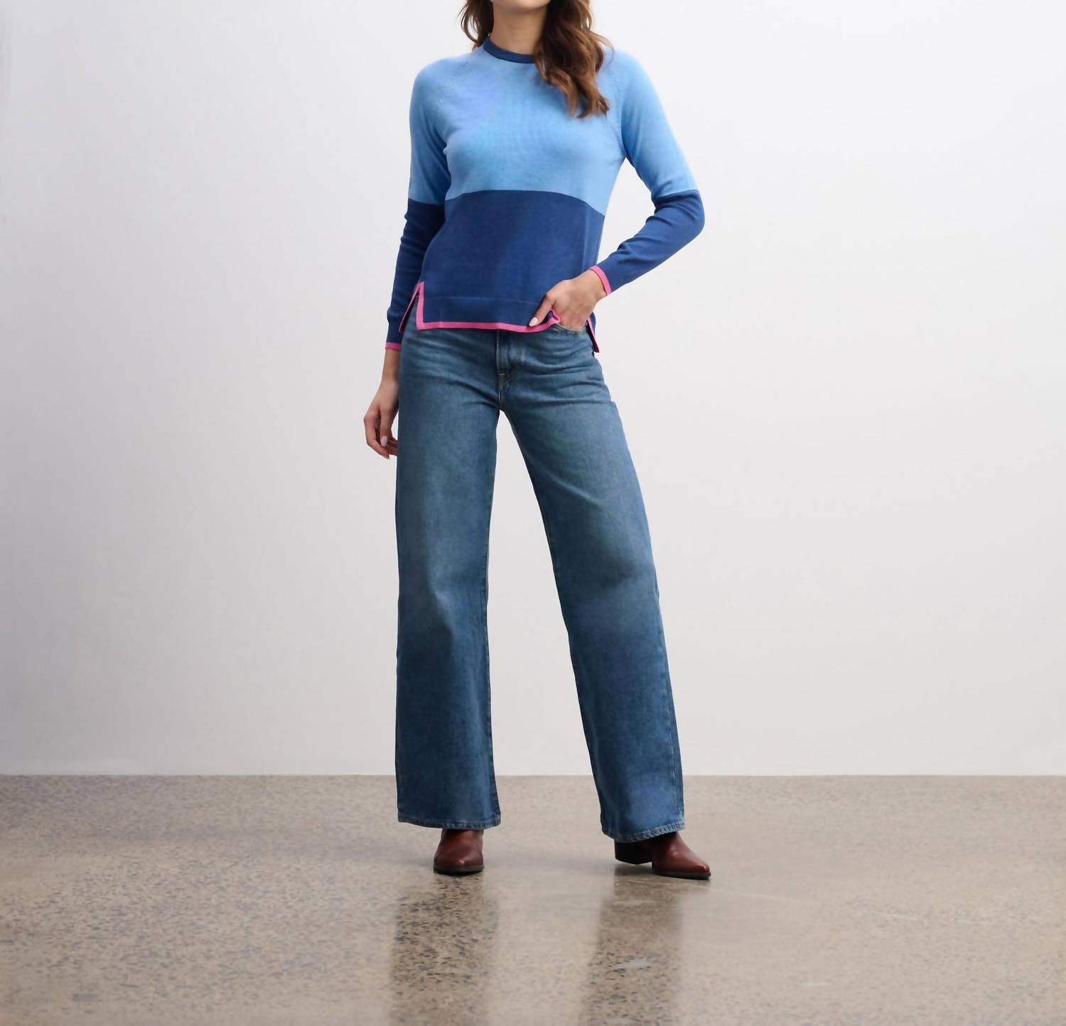 The ultimate go-to sweater, expertly crafted to provide the perfect combination of warmth and style. Its classic design and soft fabric make it a must-have addition to your wardrobe. Elevate your wardrobe with the Olivia Colorblock Tipped Sweater by Hatley, a chic choice in blue colorblock. This women's crewneck sweater features long raglan sleeves and a relaxed fit, perfect for a preppy spring look. Crafted from a cotton blend, it includes 95% cotton and 5% cashmere with advanced side seams, ribbed hem, and side vents. The sweater offers pull-on closure and should be laid flat to dry after machine washing.