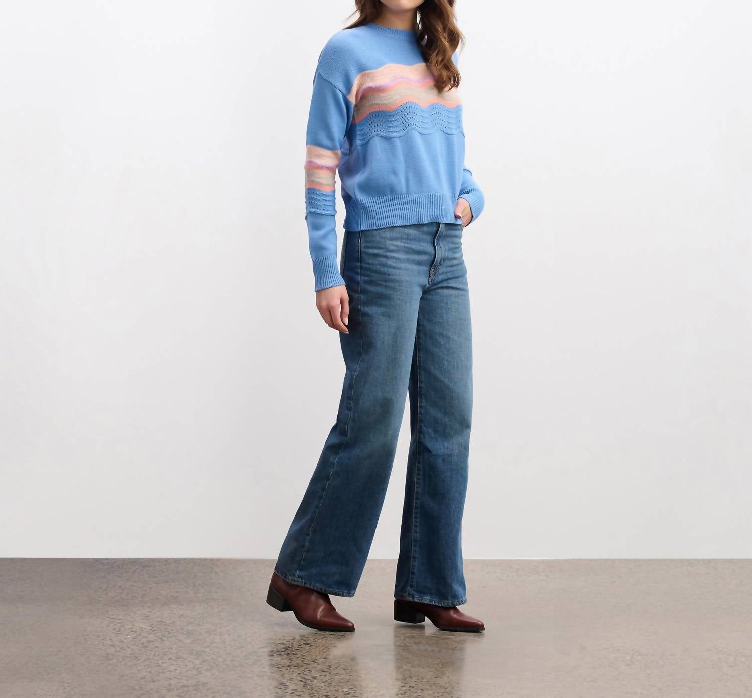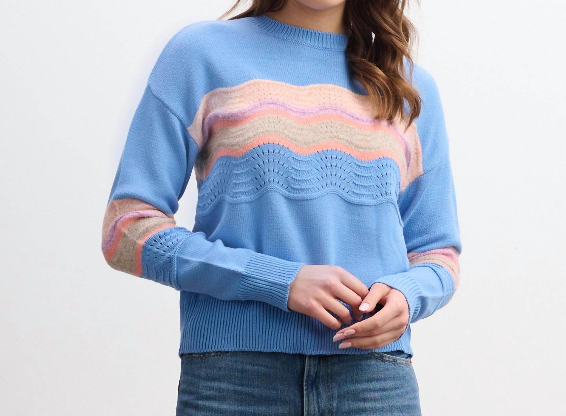 The ultimate go-to sweater, expertly crafted to provide the perfect combination of warmth and style. Its classic design and soft fabric make it a must-have addition to your wardrobe. Elevate your wardrobe with the Hatley Pointelle Wave Sweater in Sky Blue Ripple, perfect for chic everyday wear. This sweater features long sleeves and a relaxed fit with dropped shoulders, crafted in a soft jersey knit of 60% cotton and 40% acrylic. The regular-length design sits comfortably at the hip and showcases a subtle wave pattern, finished with ribbed hem and cuffs. With a classic crew neckline and pullover style, it's a versatile piece for pairing with denim, skirts, or tailored pants.