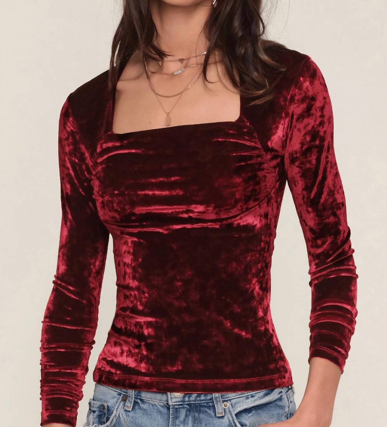 Great fit, cute design, soft fabric. You'll love everything about this long sleeve tee. Experience luxurious style with the Bedford Long Sleeve Top by Heartloom in a striking merlot hue. Crafted from velvet with a blend of 92% polyester and 8% spandex, it offers a fitted stretch that flatters the figure. The top showcases a scoop neck design and measures 21.5 inches in length from the high point of the shoulder. Closure: Pull on. Care: Hand wash and line dry for lasting quality.