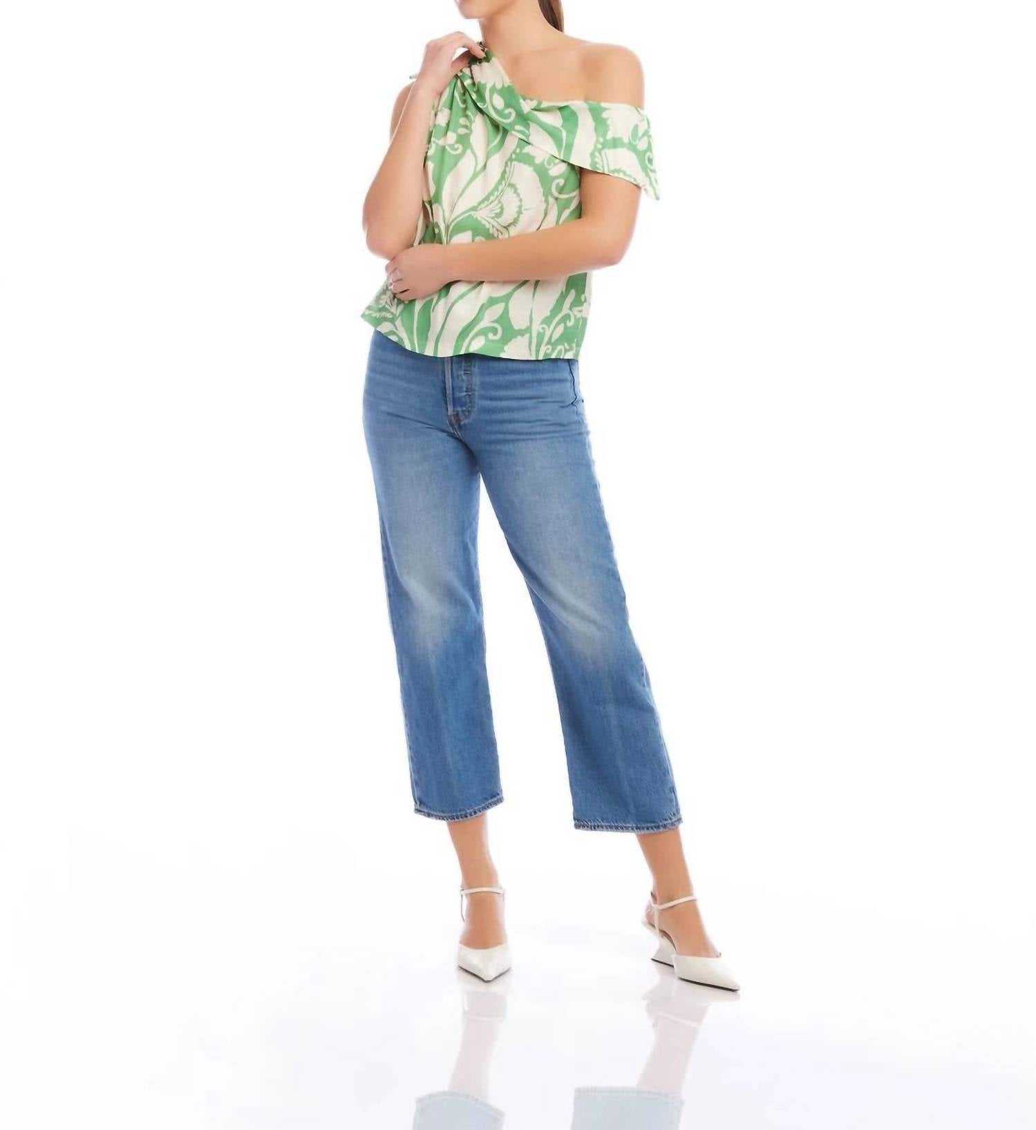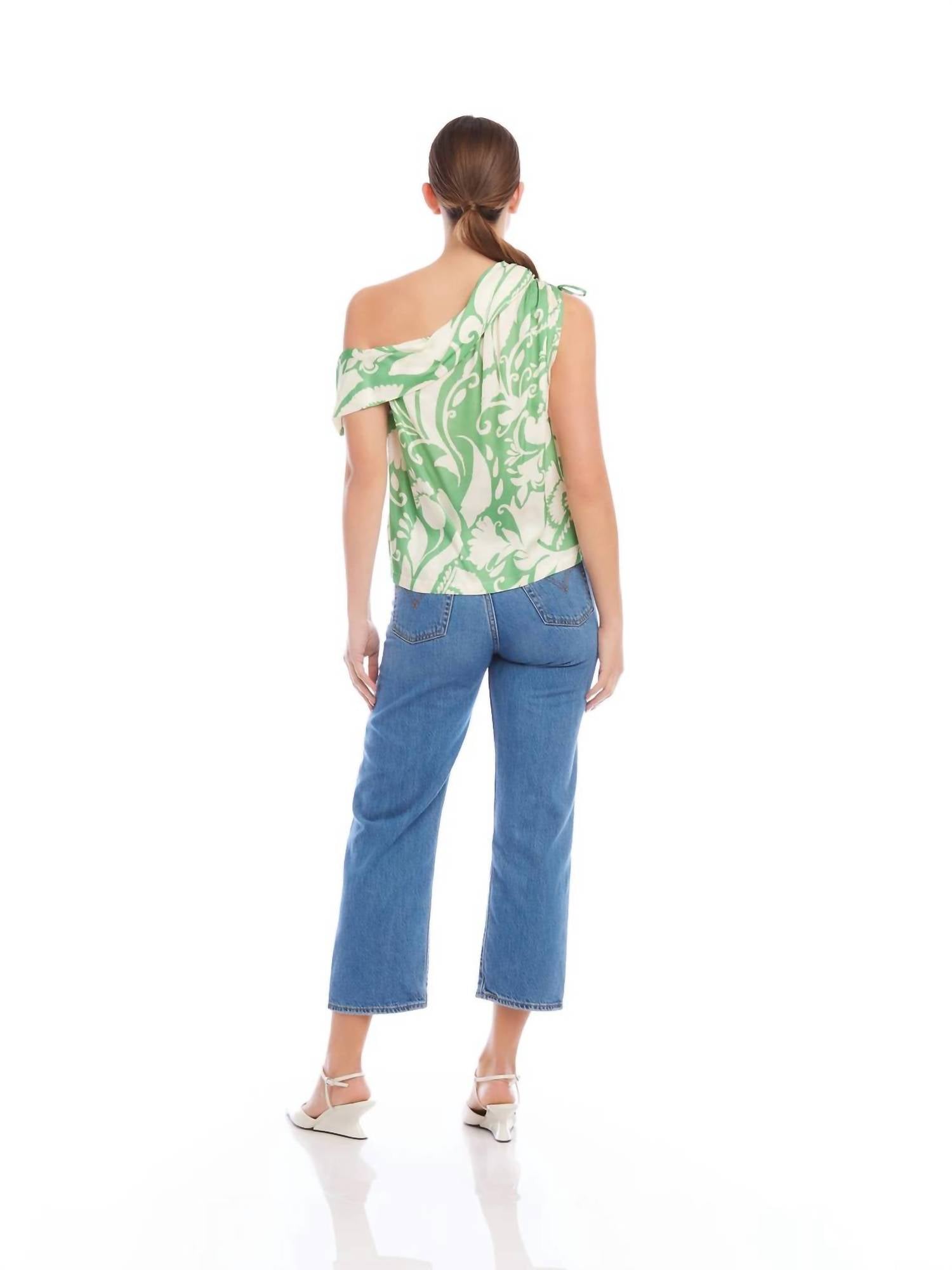 Pair this with your favorite jeans and slides for your next girls night out. The Devin Top features a chic sleeveless design with a stylish one-shoulder cut, complemented by a tie detail on the right shoulder for a unique touch. Crafted from 100% viscose in a wallpaper satin print, this top offers a luxurious feel and elegant drape. Care instructions specify dry cleaning only to maintain its quality. The length measures approximately 22.0 inches for size small. Made in the USA of Italian fabric.