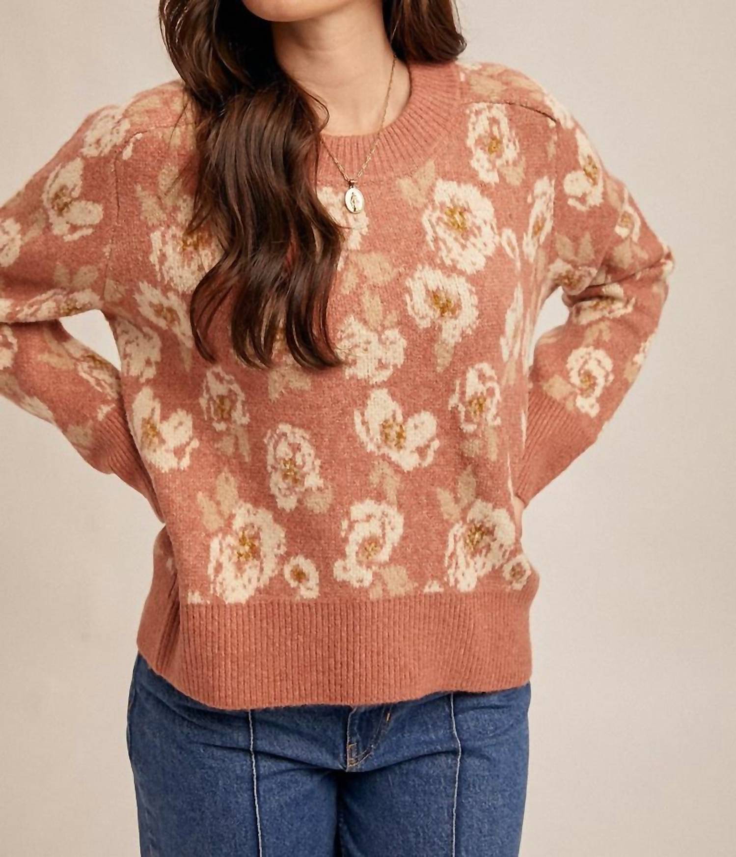 The ultimate go-to sweater, expertly crafted to provide the perfect combination of warmth and style. Its classic design and soft fabric make it a must-have addition to your wardrobe. Introducing the Floral Motif Sweater by Hem & Thread, an ultra-soft essential that promises both comfort and style. This long sleeve piece, crafted from 74% Acrylic, 22% Polyester, and 4% Spandex, showcases a charming abstract floral pattern in a soothing Winter Rose hue. Designed in a relaxed fit, it features a classic crew neck, making it ideal for minimalist spring occasions. The pull-on style simplifies wear, while care is straightforward with machine wash and lay flat to dry instructions.