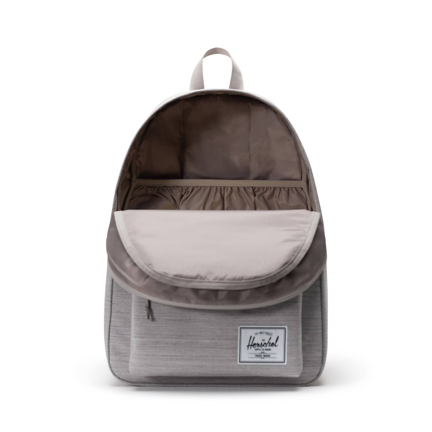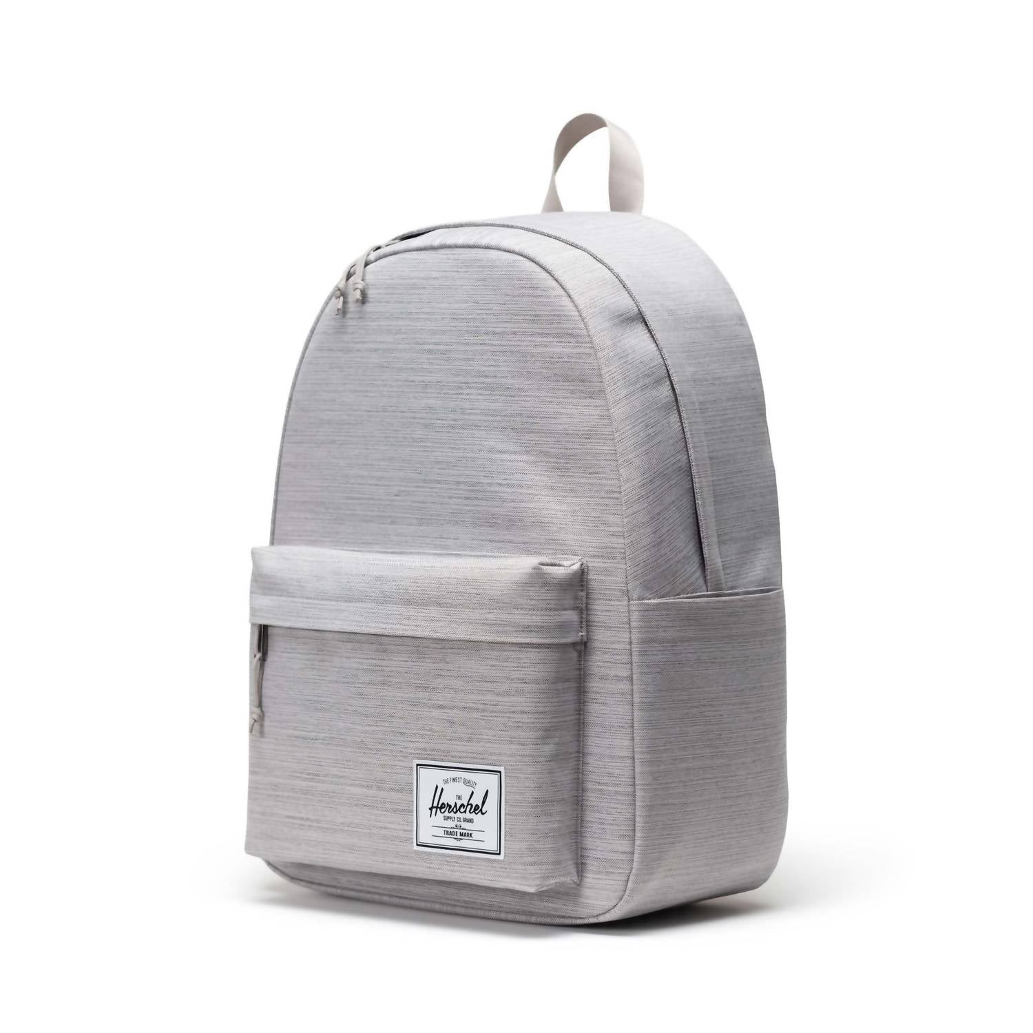 Introducing the Women's Classic XL Backpack by Herschel, a spacious and eco-friendly choice tailored for your adventures in a sophisticated Light Grey Crosshatch. Crafted from EcoSystemâ„¢ 600D fabric, this backpack uses 100% recycled post-consumer water bottles. It features a floating sleeve that fits a 15"/16" laptop and secure zippered closures with Prusik cord pulls. Carrying is easy with adjustable padded shoulder straps, plus it includes a water bottle pocket and a front pocket for convenience.