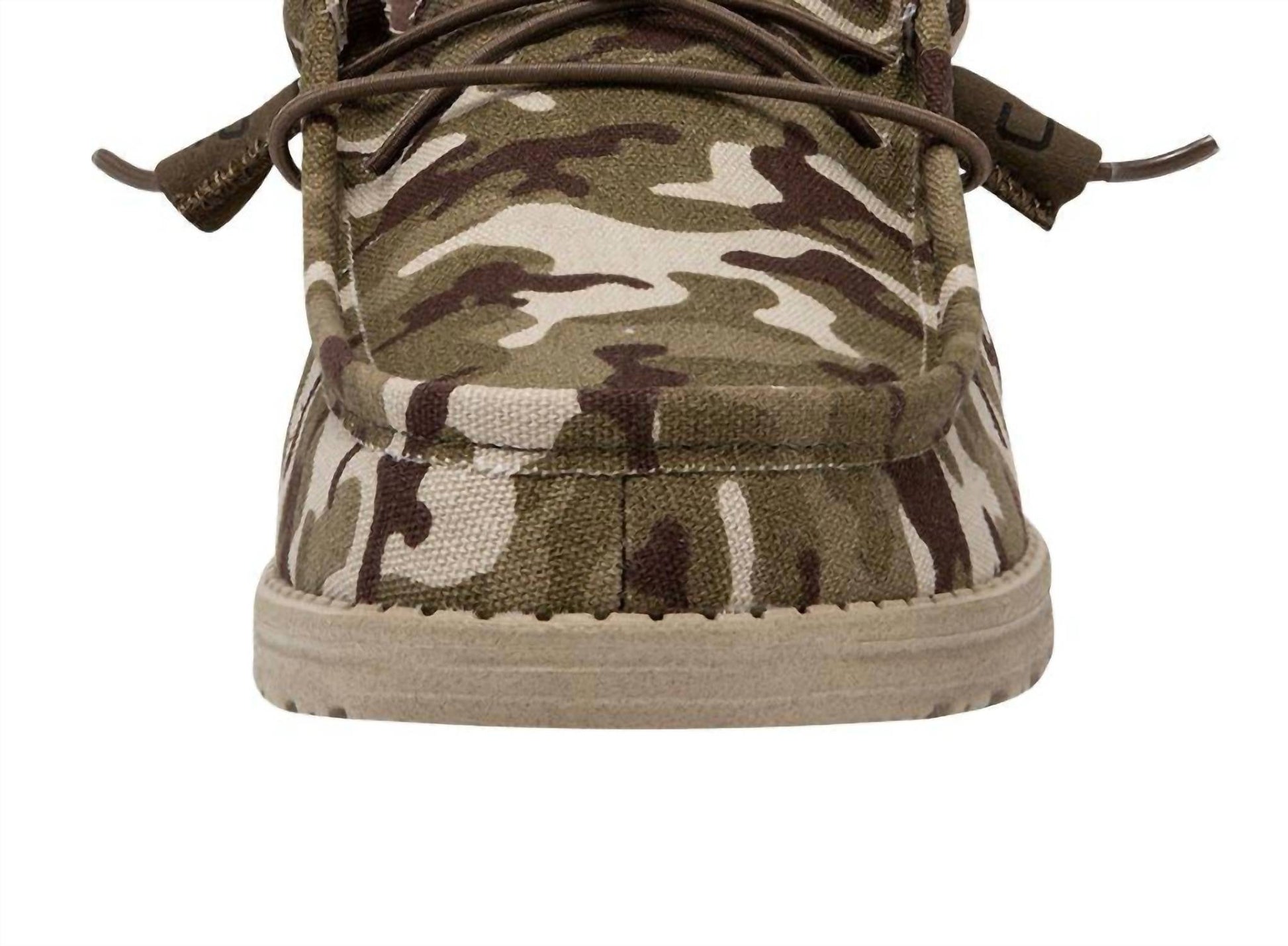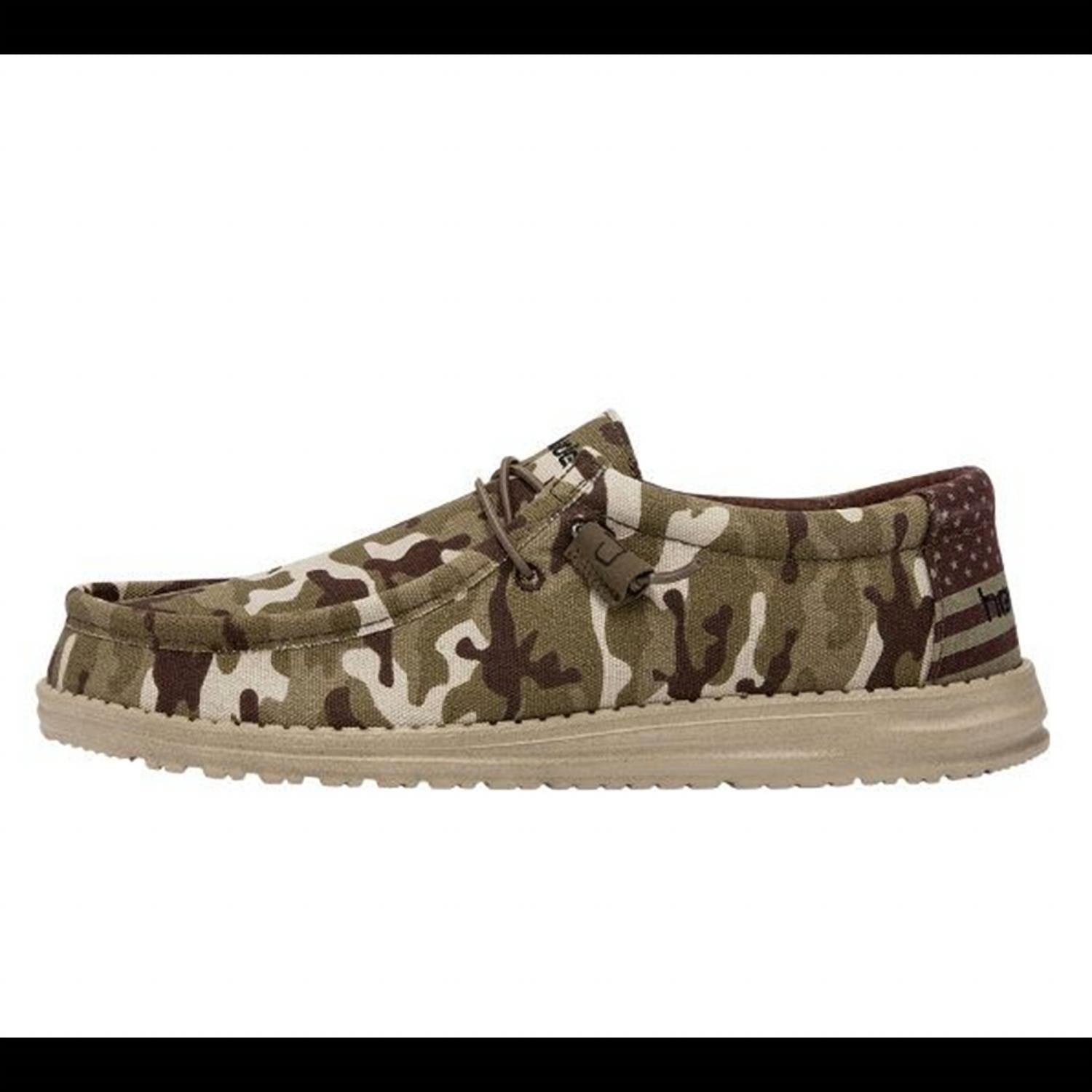 Introducing the Kid's Wally Slip-on by HEY DUDE, a streetwear-inspired moccasin in Camo Flag designed for superior comfort and style. This boys' shoe features a breathable chambray-blend upper with a cushioned ankle collar and contrasting heel detail. It boasts an easy-on system with elastic laces, an ultralight outsole, and a round toe shape for everyday ease. Care is simple with its easy-to-wash design - just air dry. Perfect for spring, this medium-width shoe ensures a flat heel for a relaxed fit.