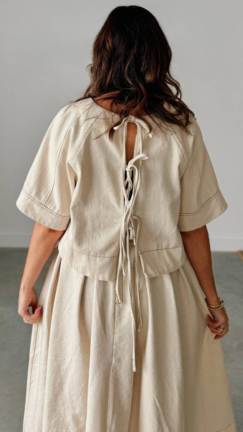 Pair this with your favorite jeans and slides for your next girls night out. Introducing the Only Eyes For You Skirt Set by Heyson, a chic ensemble in a versatile oatmeal hue perfect for any vacation wardrobe. This set includes a high-waisted, pleated maxi skirt and a structured short sleeve top finished with an elegant back tie closure. Crafted entirely from 100% cotton, it promises comfort and breathability. Its minimalist, solid design enhances its modern appeal, fitting true to size for confident and effortless wear.