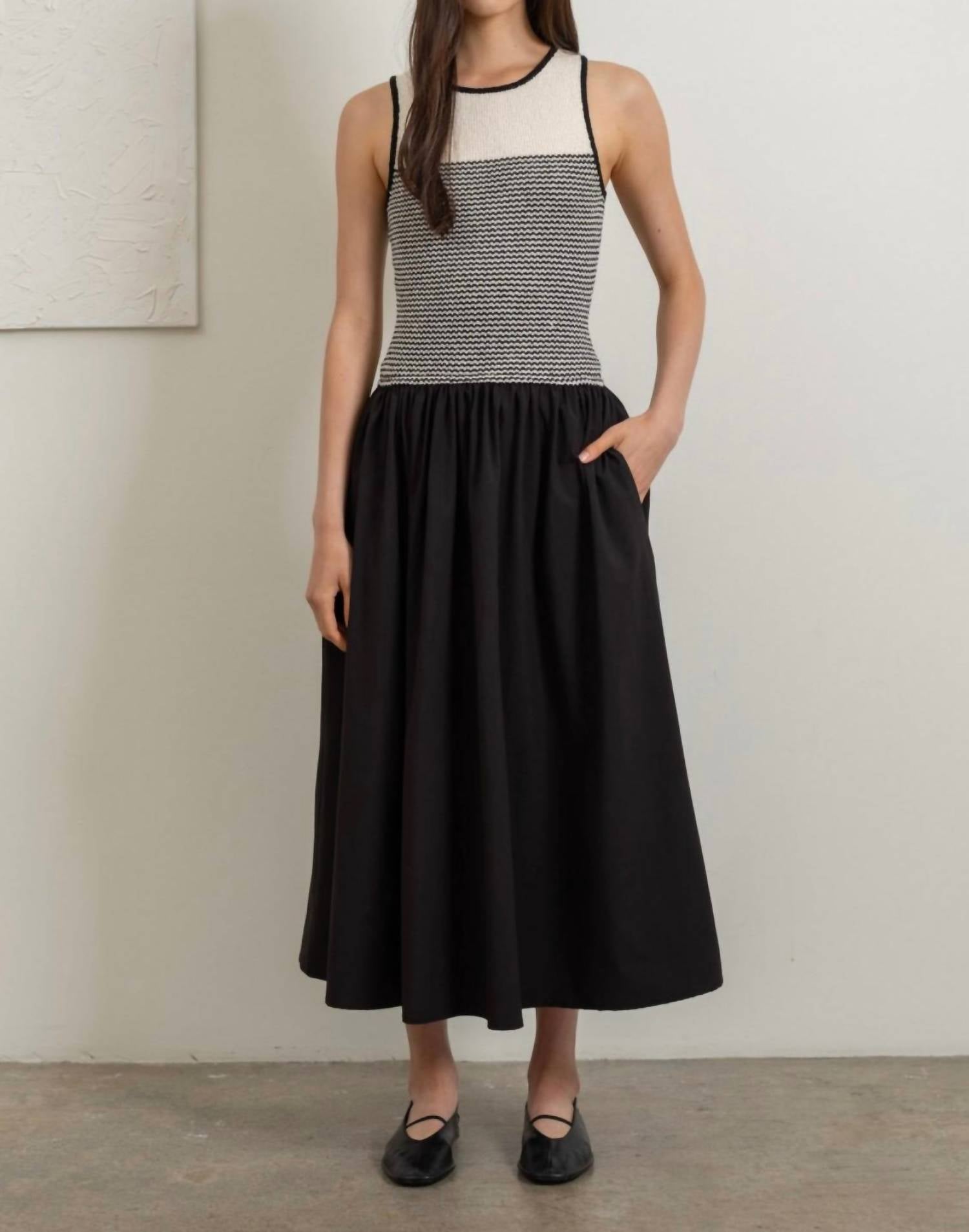 A midi dress so versatile, your options for wearing it are endless. Embrace chic minimalism with the Two-tone Woven Midi Dress by Heyson, a standout piece for any dinner party. This sleeveless dress features a solid two-tone design with a knit bodice in black, offering a fitted and stretchy crewneck silhouette, while the flowing A-line skirt adds elegance. Crafted from a blend of 50% recycled polyester, 50% polyester for the top, and 50% cotton, 40% nylon, 10% spandex for the skirt, it ensures a comfortable fit. Closure: Pull-on. Style this versatile dress with an array of accessories for a timeless, sophisticated look.