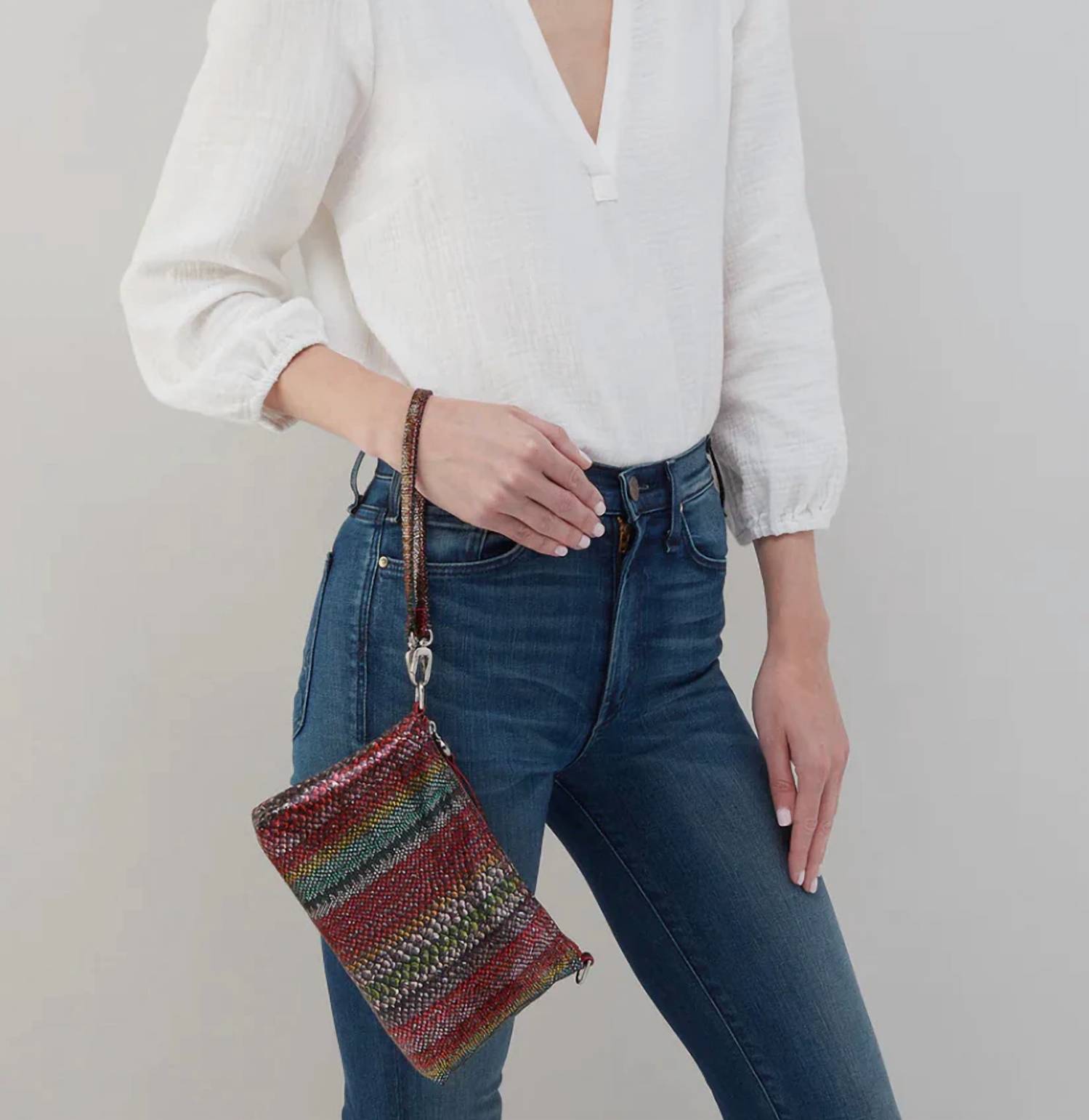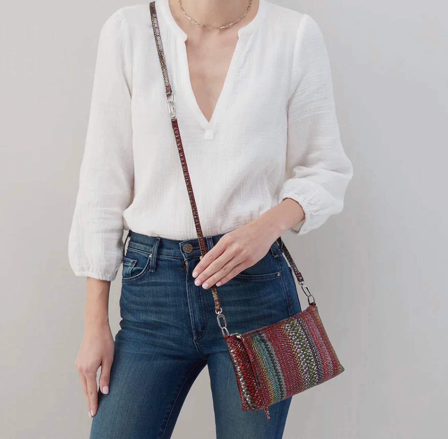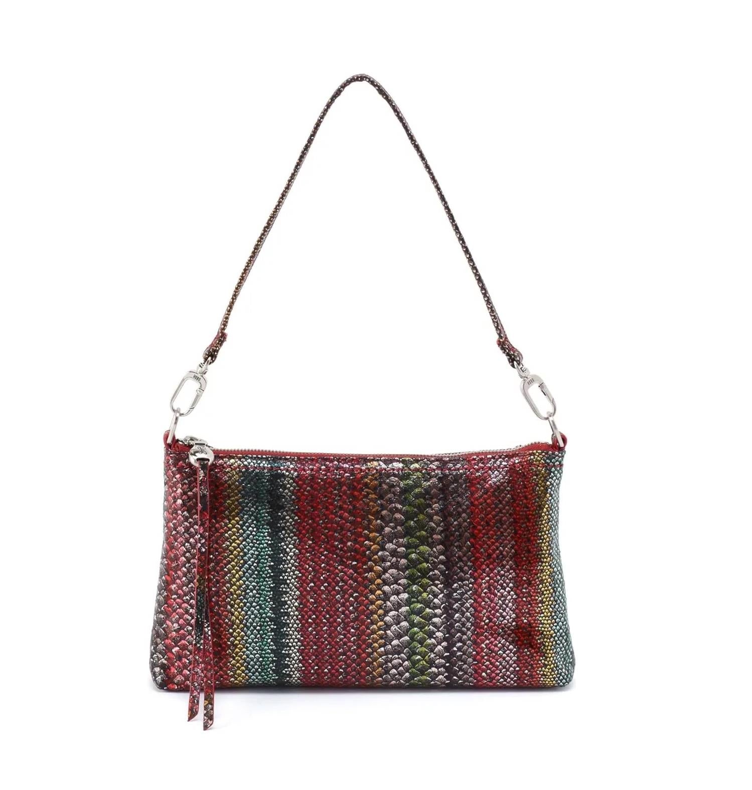 A casual and cute take on everyone's favorite crossbody bag. Introducing the Darcy Convertible Crossbody Bag by HOBO, a chic accessory in a festive Holiday Striped hue. Crafted in printed leather, it features brushed nickel hardware and a practical zip closure. This versatile bag is designed with a signature phone pocket on the exterior back and interior compartments, including a bill slot, zip pocket, and six credit card slots. Wear it as a crossbody, baguette bag, or wristlet with the adjustable, removable strap, offering a 7" short strap drop and a 26" long strap drop. Dimensions: 9" W x 5" H x 1.5" D.