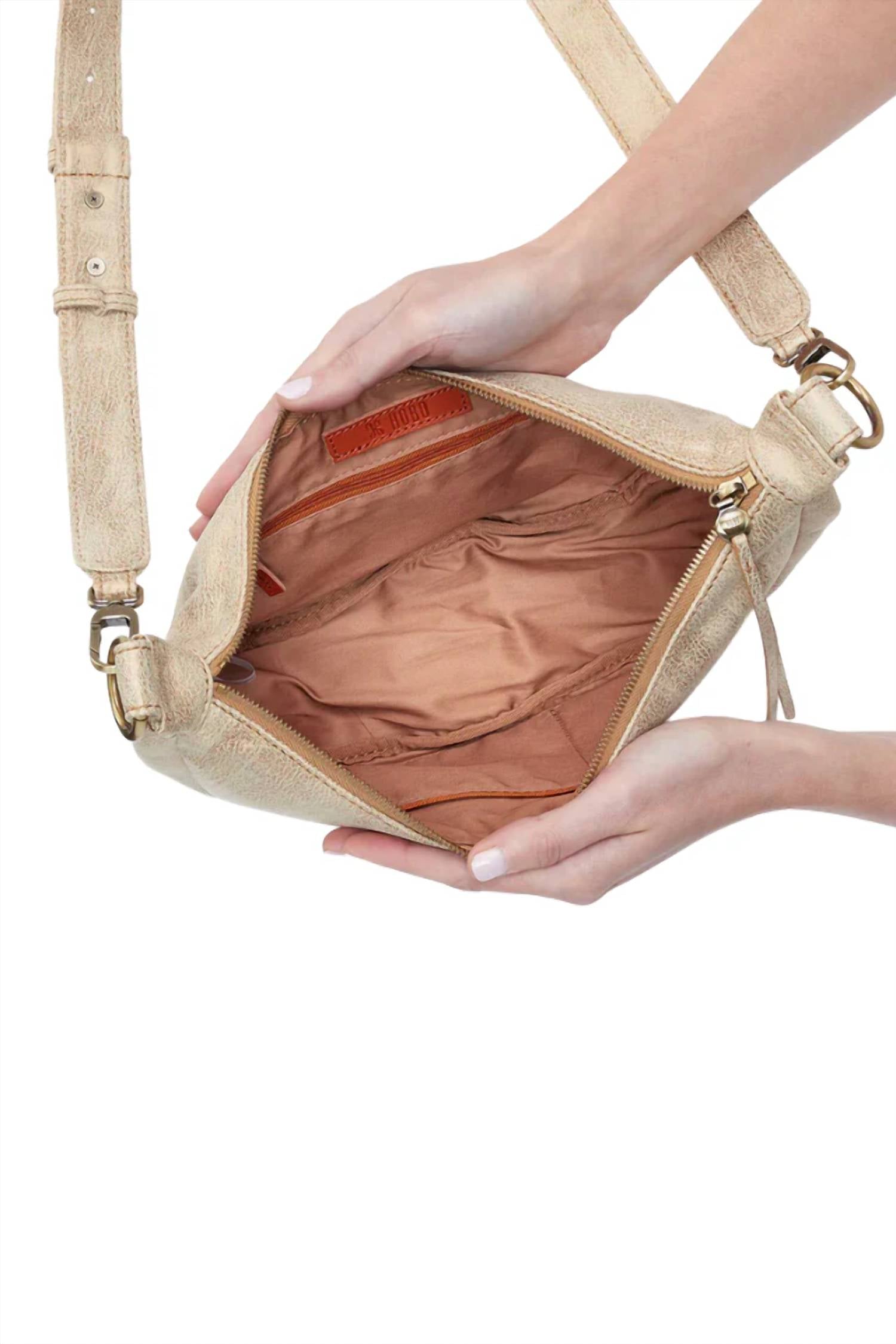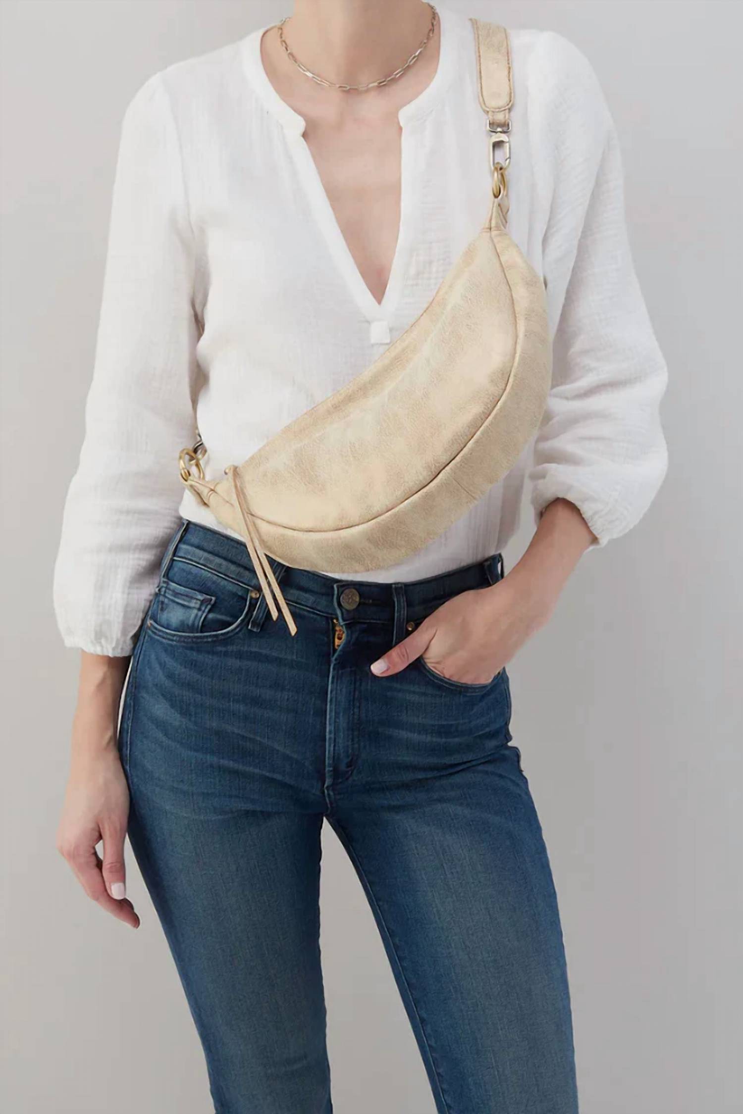 The crossbody bag is a trend that is here to stay and we especially love this style. Discover the Knox Sling Bag by HOBO, a chic crossbody designed with Old English brass hardware and a practical zip closure. Crafted from luxurious leather in a stunning Gold Leaf hue, this bag features a solid leather single strap with an adjustable strap drop of 17" to 22". Inside, you'll find a sandlewood lining with a thoughtfully organized interior, including a slip pocket, pen pocket, and zip pocket to keep your essentials secure. Measuring 12.5" W x 6" H x 3.5" D, it's perfectly sized to fit your phone and more.