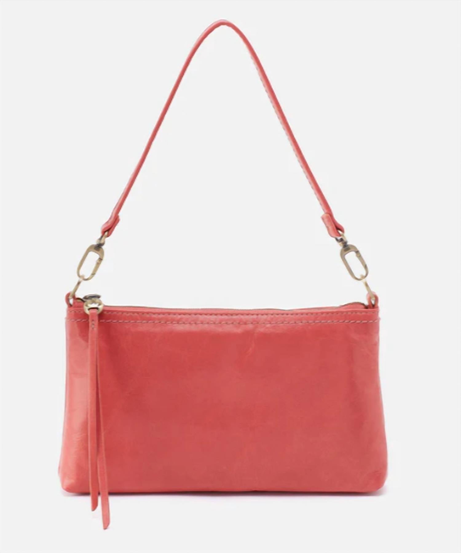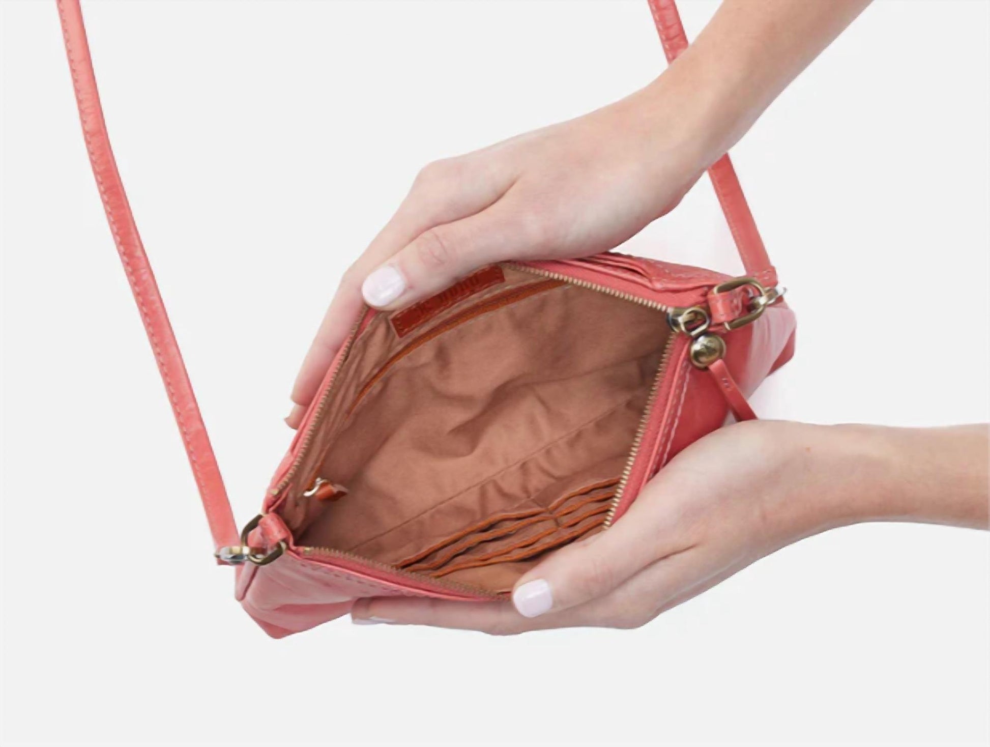 The crossbody bag is a trend that is here to stay and we especially love this style. Introducing the Women's Darcy Convertible Crossbody by HOBO, a stylish and versatile bag in an enchanting Cherry Blossom hue. Crafted from solid leather, this bag features rose gold hardware, a zip closure, and a convertible strap that allows you to wear it as a crossbody, baguette bag, or wristlet. Its dimensions are 8.5" W x 6" H x 2.5" D, with interior slots and an exterior signature phone pocket for optimal organization. This bag ensures practicality with its tailored design, perfect for your phone and other essentials.