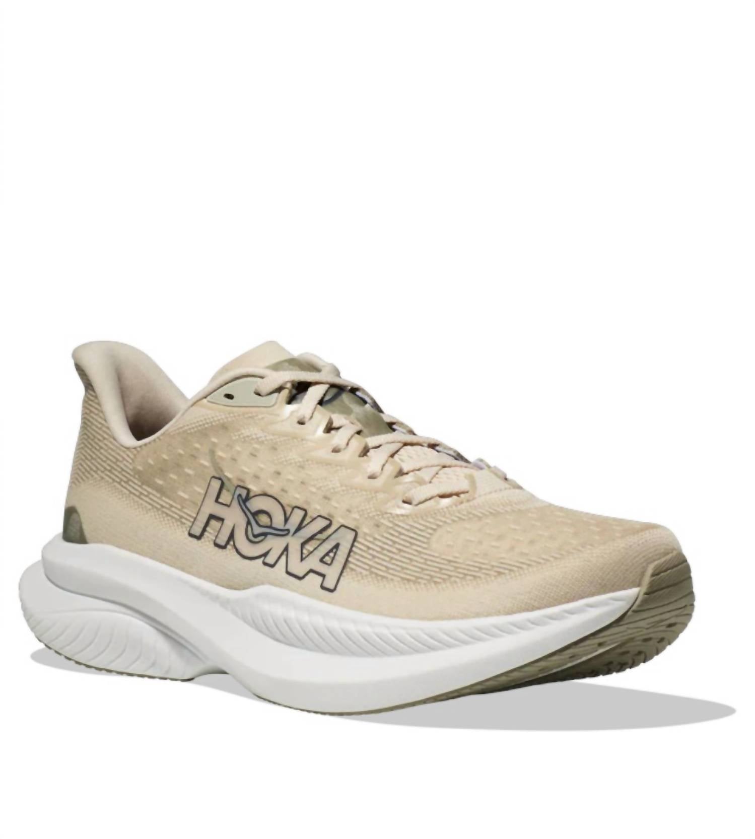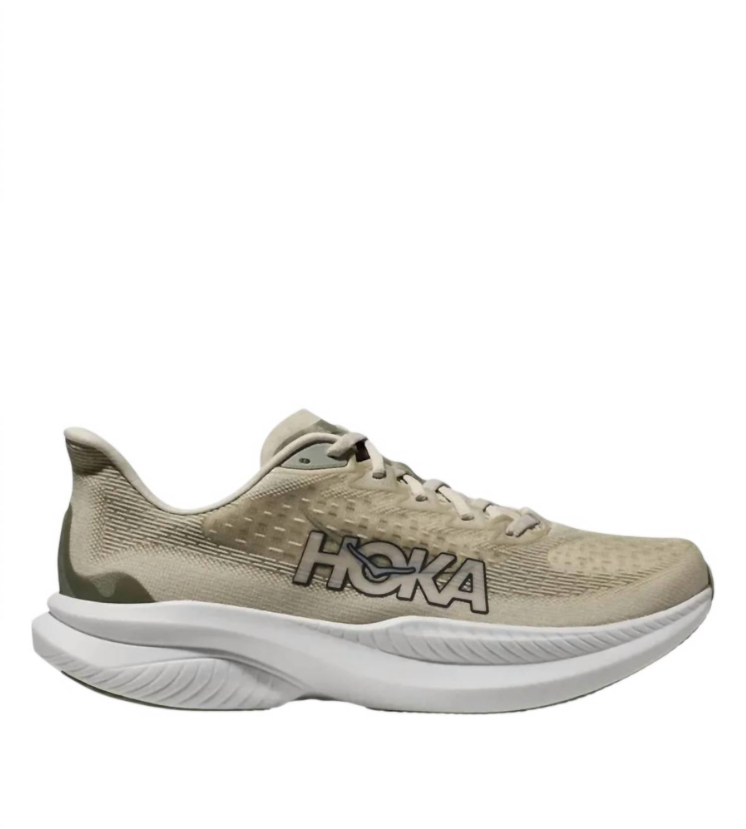 Elevate your running experience with the Hoka Men's Mach 6 Running Shoes in a sleek Oat Milk and Barley colorway. Crafted from durable nylon, these shoes are designed to perform in various athletic scenarios, meeting the demands of fitness and workout enthusiasts. The round toe shape enhances comfort during prolonged activities, ideal for athleisure trends throughout the spring season. Embrace the perfect blend of function and fashion with this must-have pair.