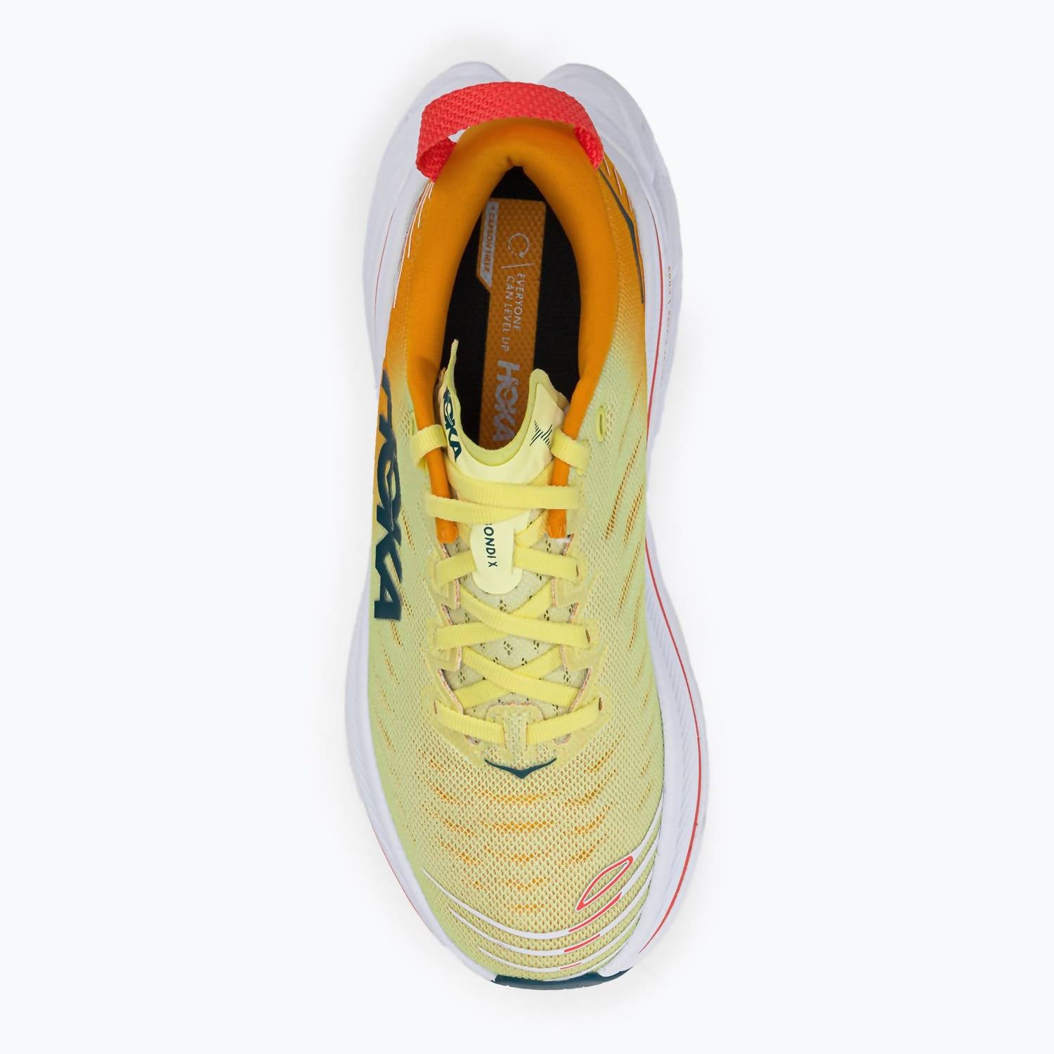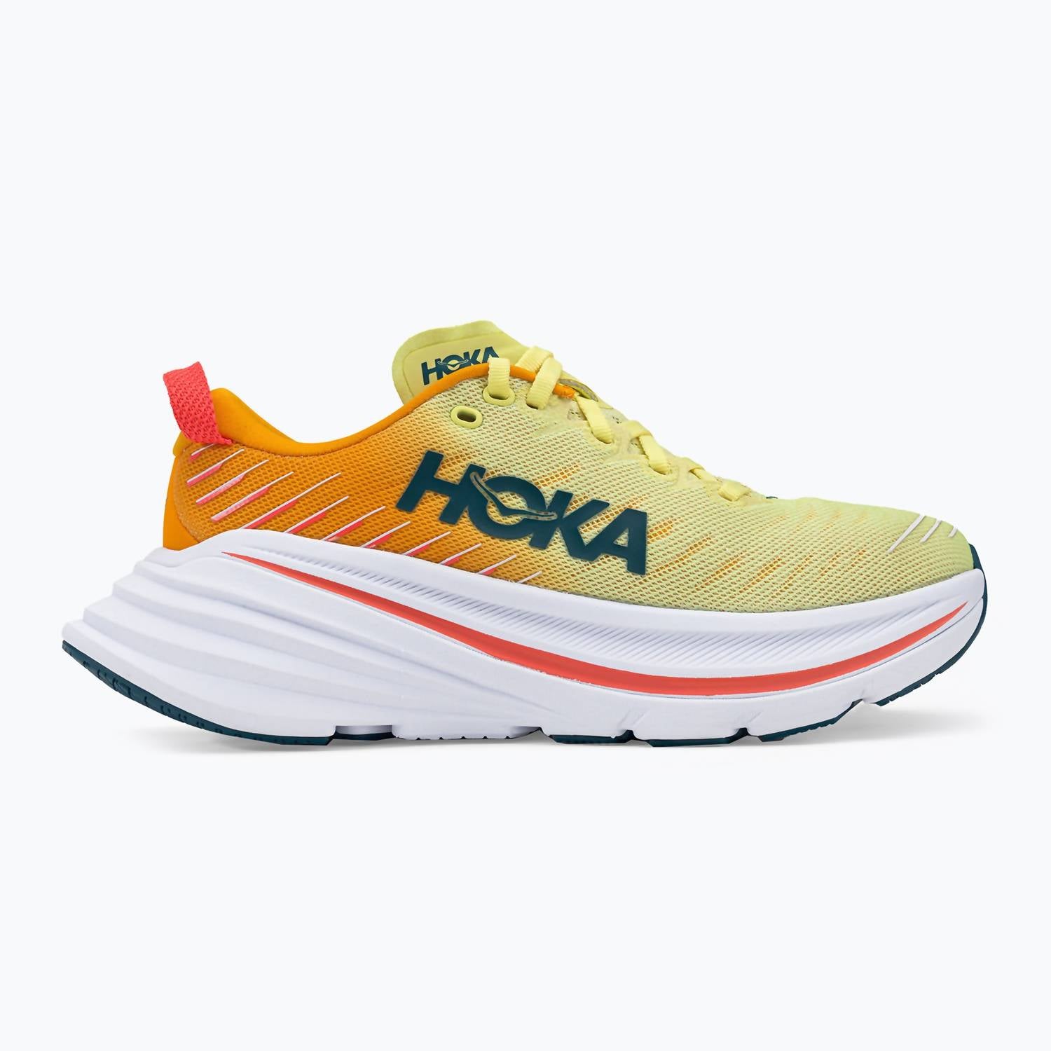Stylish, comfortable and supportive. These athletic sneakers check all of the boxes. Experience the lightweight comfort of the Women's Bondi X Running Shoes by Hoka, perfect for your road running activities. This pair, in an eye-catching Yellow Pear and Radiant Yellow, is designed with a breathable mesh upper featuring 3D hotmelt yarns for enhanced durability. With vegan-friendly materials, a perforated EVA tongue, and an Ortholite sockliner, these shoes are not only environmentally conscious but also provide maximum comfort and support. Ideal for summer workouts with a low flat heel, these shoes weigh just 9 ounces and are available in size 7 US, regular width.