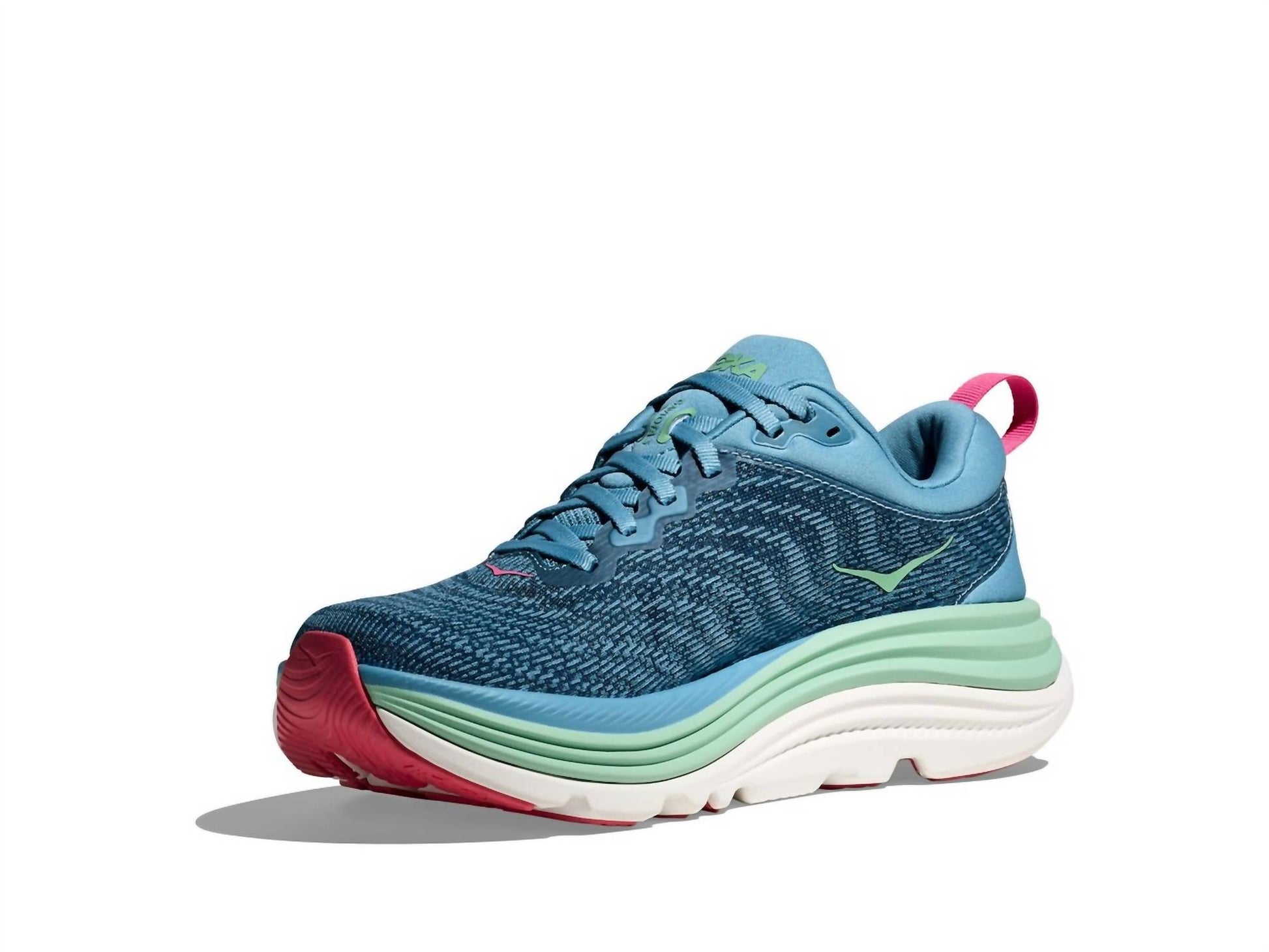 Stylish, comfortable and supportive. These athletic sneakers check all of the boxes. Experience unparalleled stability with the Women's Gaviota 5 Running Shoes by Hoka, available in Alpine Blue / Jadeite. Expertly constructed with the innovative H-Frame™ for enhanced stability, these shoes feature a breathable creel jacquard upper, ultra-plush collar, and Bondi-level cushioning for optimal comfort. Designed with a round toe and flat heel under 1 inch, they are perfect for fitness and workout sessions. Embrace the athleisure trend this spring and enjoy the reliable performance during your runs.