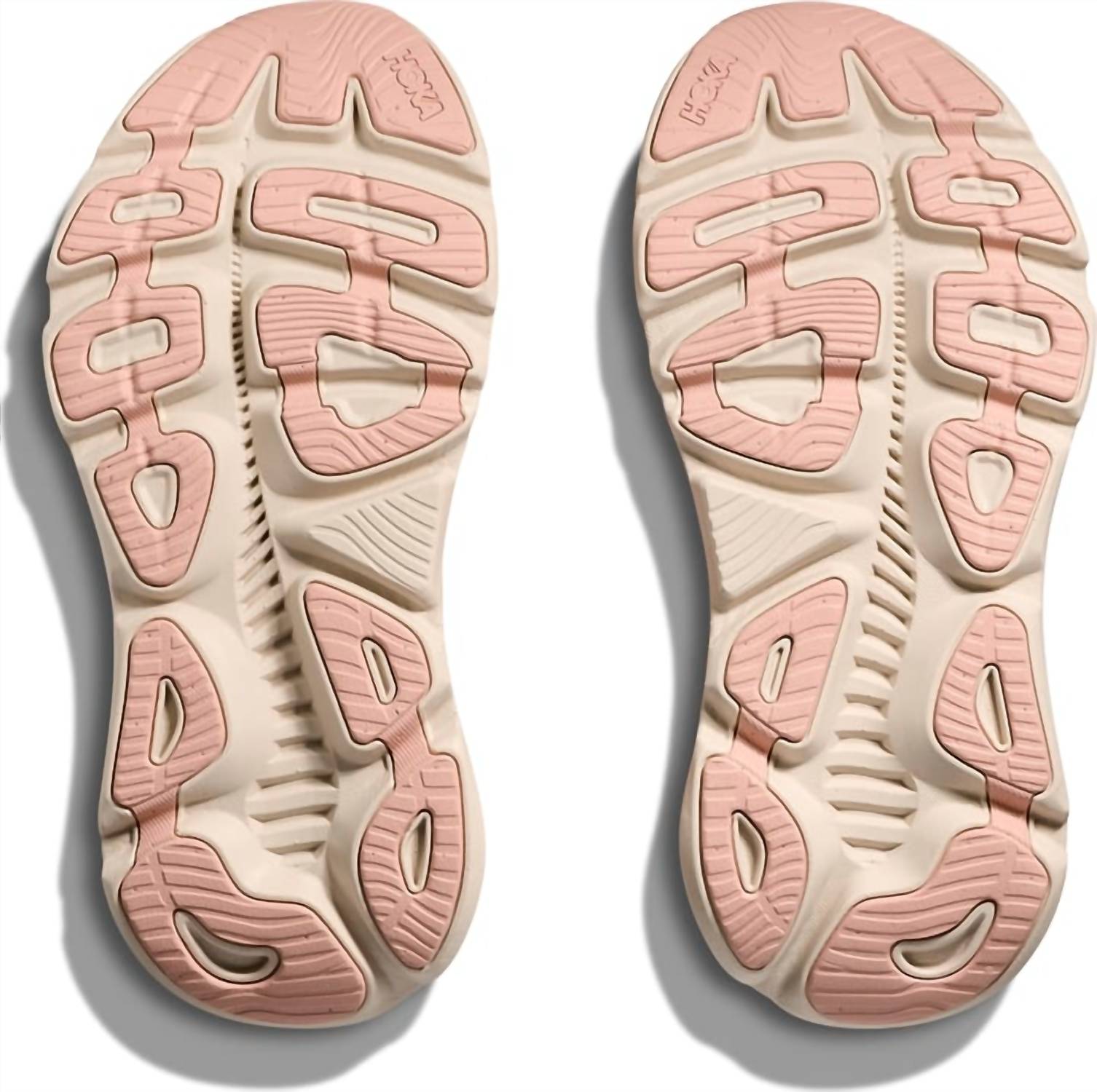 Workout in style with these adorable athletic sneakers. Introducing the Women's Gaviota 5 Shoes by Hoka, crafted for comfort and performance in a rose latte/rose cream palette. These running shoes feature a stabilizing H-Frame™ and a soft EVA foam sole for a lightweight feel, enhanced by a breathable creel jacquard mesh upper made from recycled materials. Designed with a soft tongue and collar, they ensure ankle comfort and incorporate 100% recycled polyester midfoot brace ghillies. Built wider by approximately 4 mm than the Clifton/Bondi models, they provide a smooth running experience with an early stage MetaRocker™.