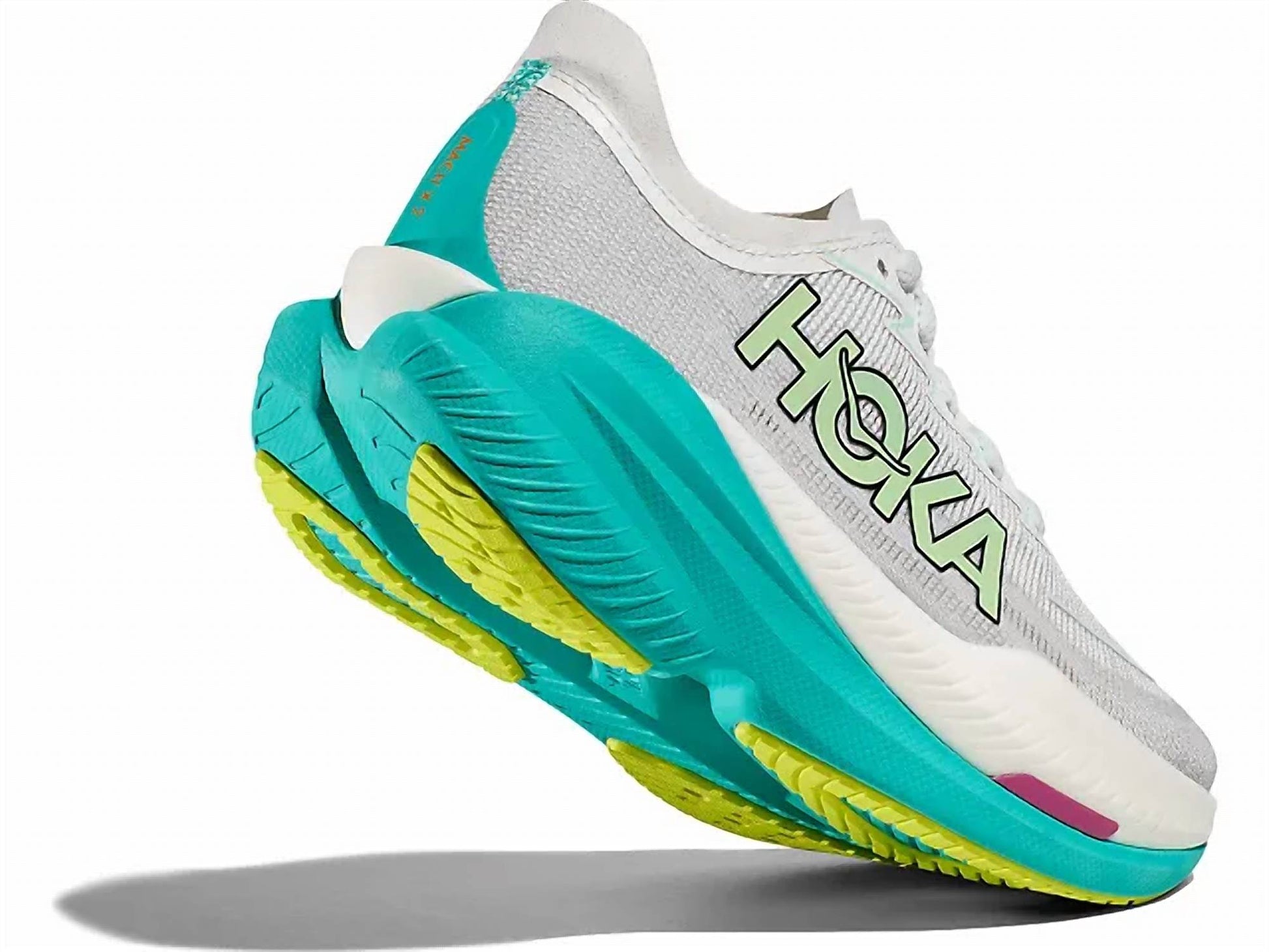 Stylish, comfortable and supportive. These athletic sneakers check all of the boxes. Discover the Hoka Women's Mach X 2 Performance Running Shoes, engineered for high performance in both training and competition. Crafted with an ultra-breathable woven mesh upper, these shoes provide a precise fit and constant ventilation. A dual-density midsole combines a Peba upper layer with a CMEVA lower layer for impact absorption, while the Pebax Rnew plate boosts propulsion. Featuring a Durabrasion Rubber sole, flexible heel area, and Reflective details, these shoes are designed for a smooth, forward-moving stride. Ideal for fitness and workout enthusiasts seeking athleisure trends this summer.