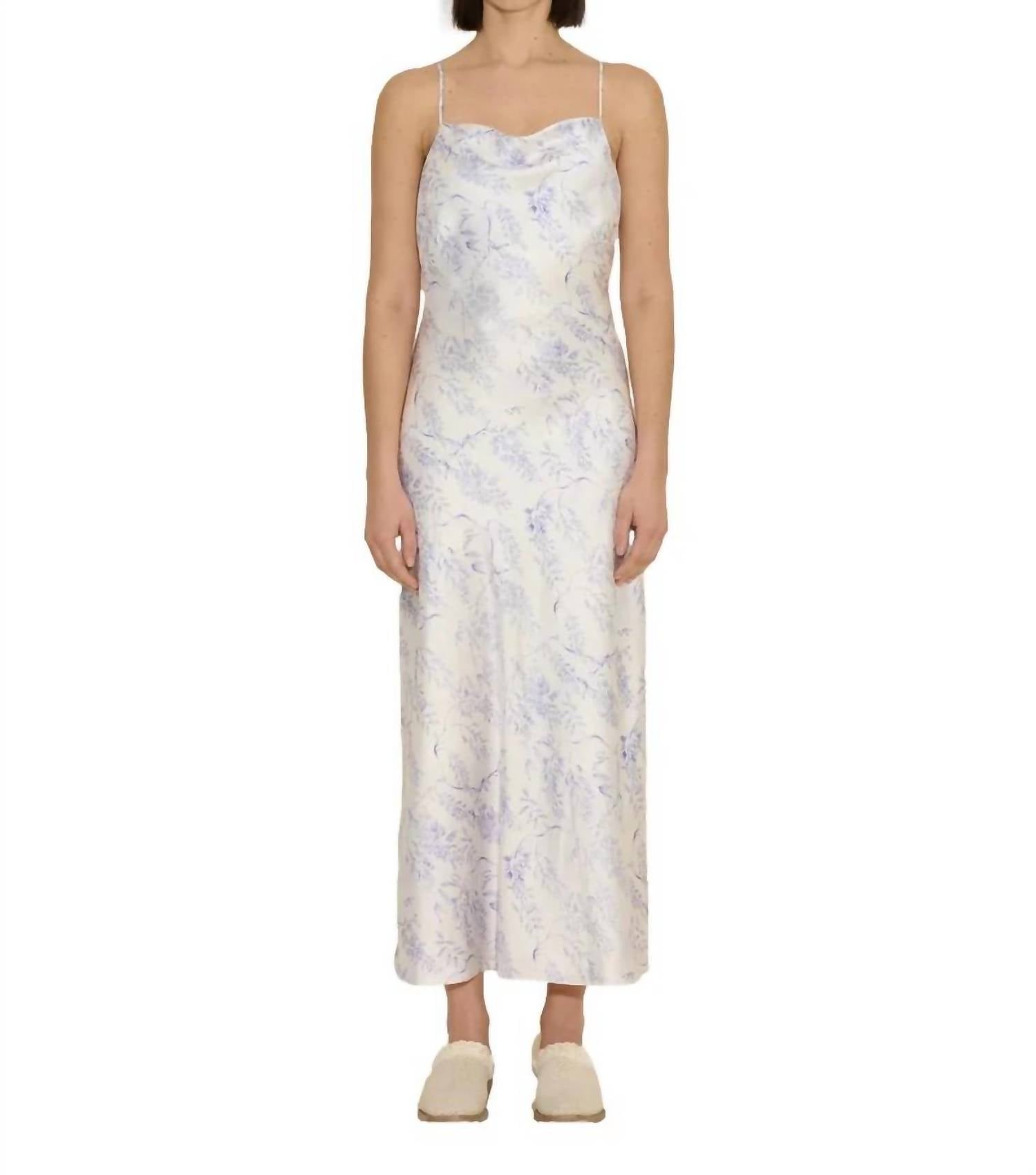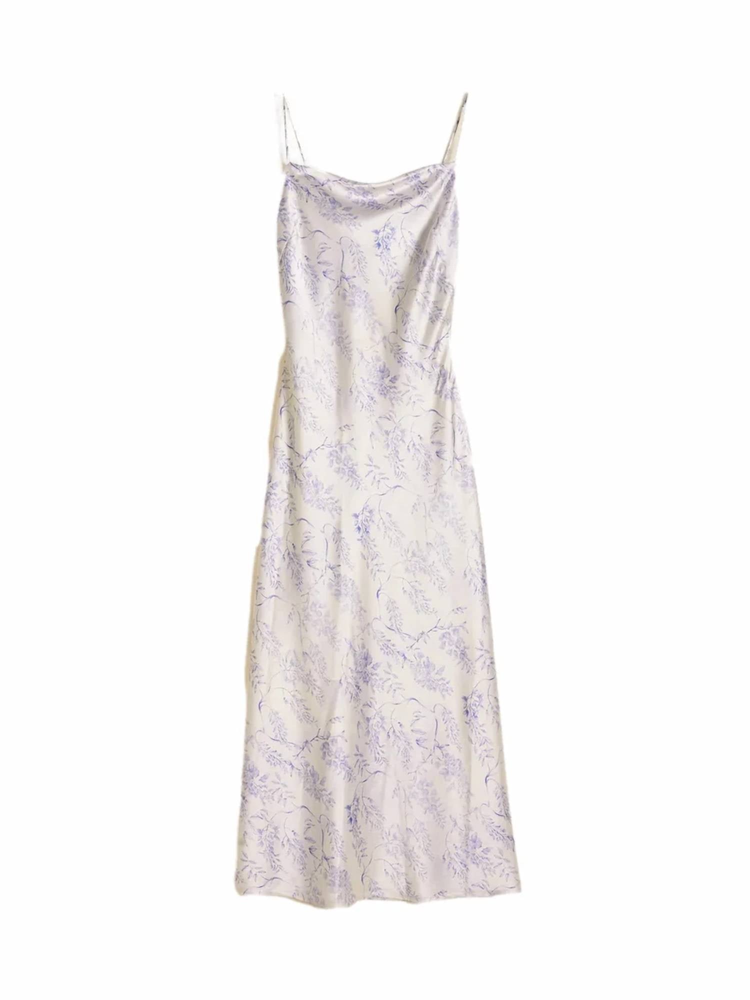 A midi dress so versatile, your options for wearing it are endless. Introducing the Holzweiler Eila Print Slip Dress in a charming Lilac Mix, a chic addition to any evening event. Featuring spaghetti straps and a trendy 90s-inspired cowlneck, this midi dress showcases a floral pattern with a flattering slim silhouette and side slit. Crafted from 100% recycled polyester with a viscose lining, it is both stylish and eco-friendly. Closure: Side zipper. Please refer to specific care instructions provided separately.