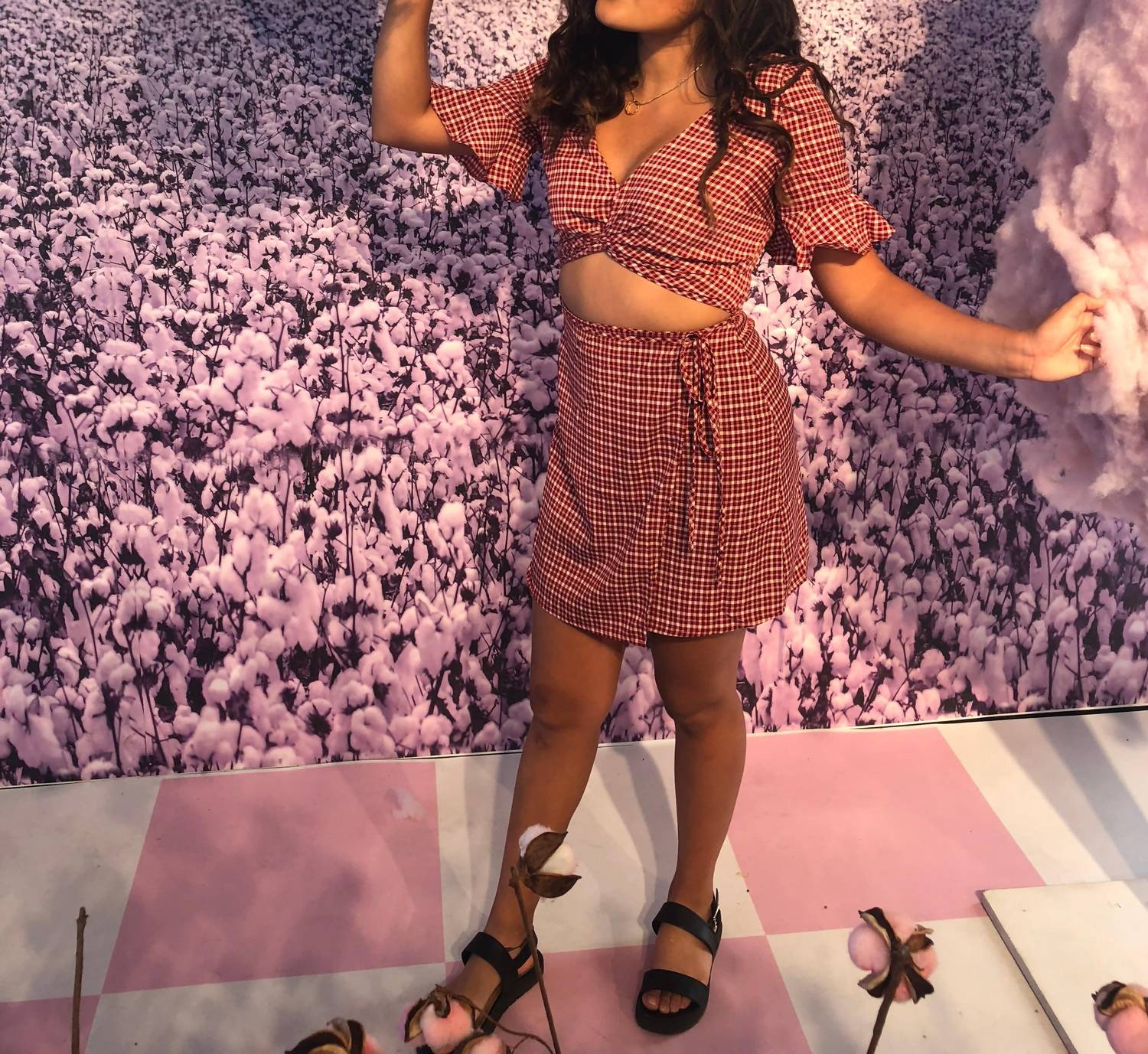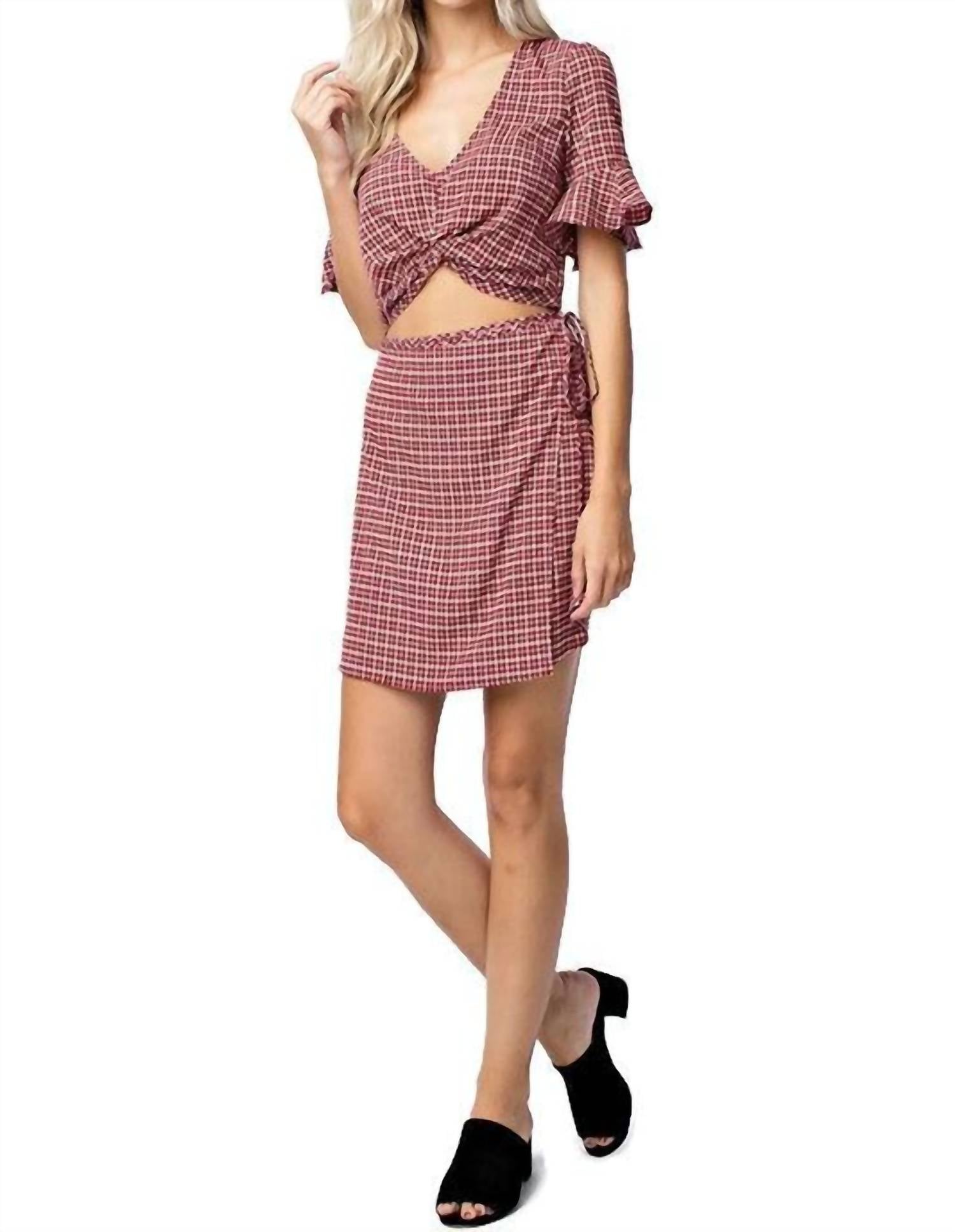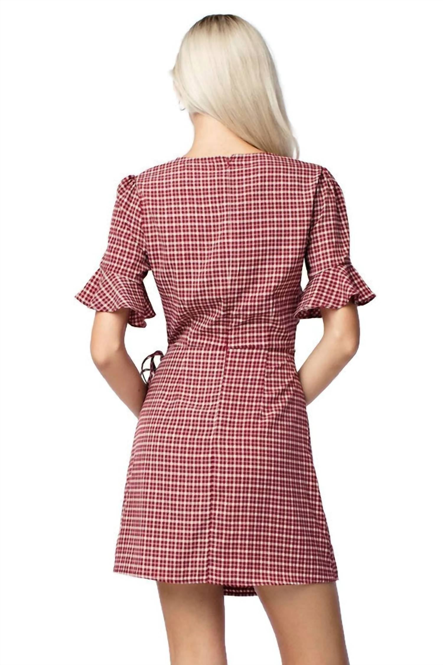 The kind of easy and flattering dress you'll be reaching for all season long. Turn heads at any holiday party with the Picture Perfect Mini Dress by Honey Punch. Showcasing short ruffled sleeves, this plaid and check polyester dress embodies a vintage A-line silhouette complemented by a deep V-neck and midriff cutout for a captivating look. With a fitted design and faux wrap skirt, it closes with a convenient zip closure. Suitably elegant for a Spring Easter gathering, sizes range from Extra Small to Large with lengths varying from 32" to 34".
