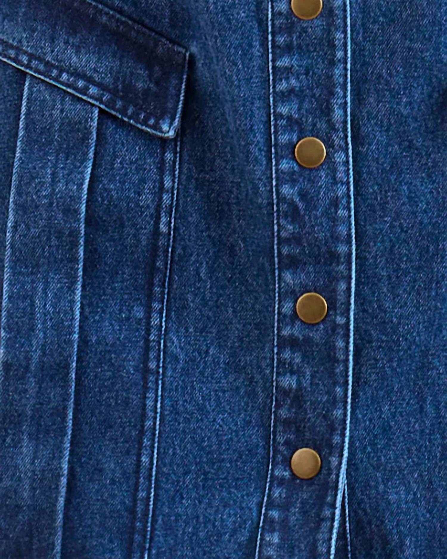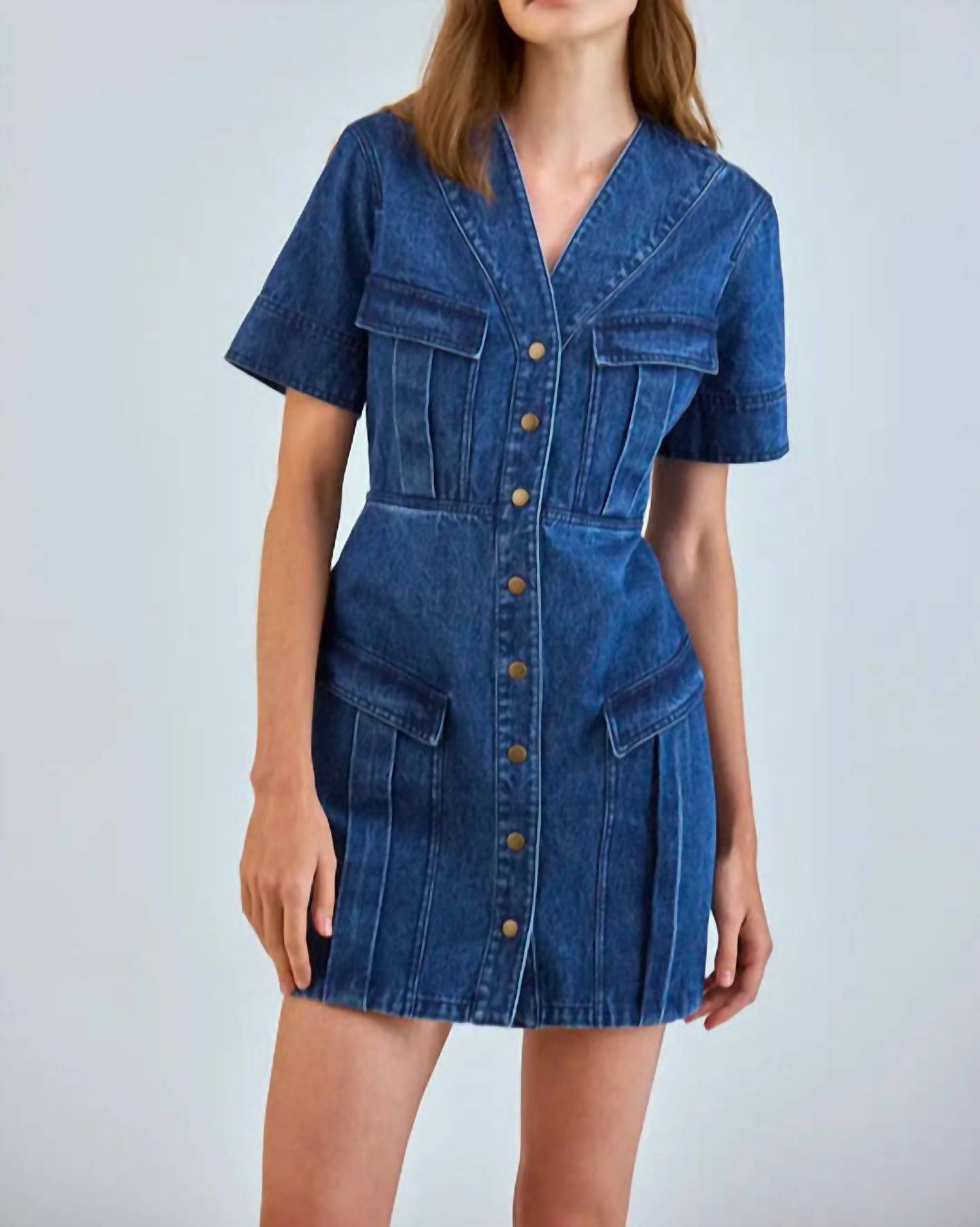 The kind of easy and flattering dress you'll be reaching for all season long. Introducing the Gwen Mini Dress by Hunter Bell, a perfect blend of style and comfort in Harbor Denim. This dress features short sleeves and is crafted from 100% cotton, offering a relaxed A-line silhouette. The mini-length dress is designed with a practical snap front closure and functional chest and skirt pockets. For care, machine wash and line dry to keep this effortless piece looking fresh for your spring vacation wardrobe.