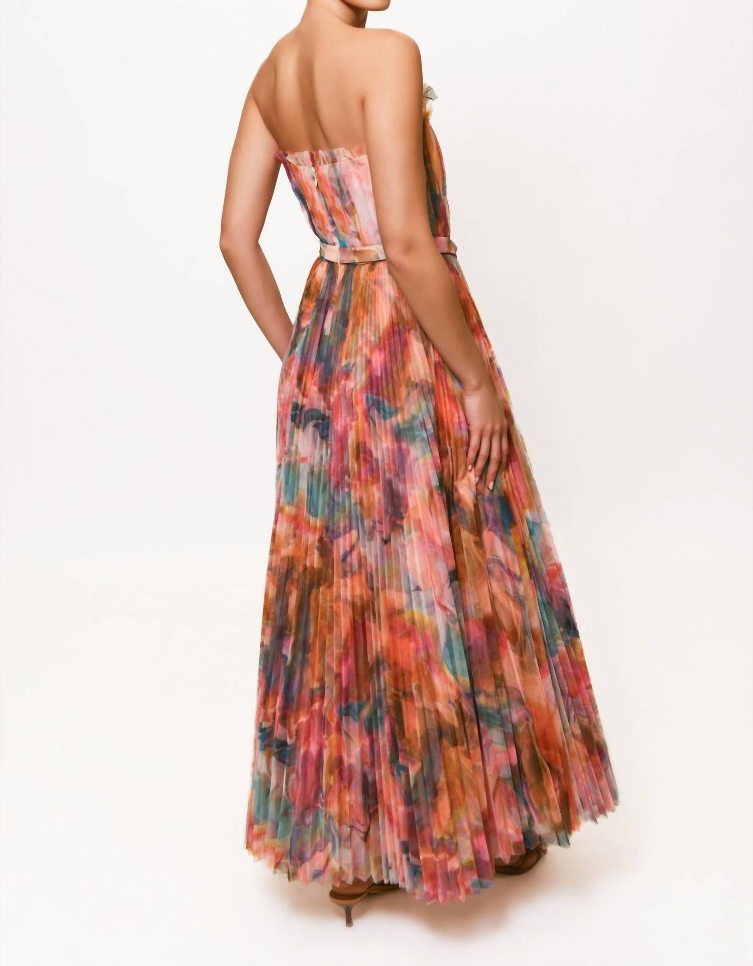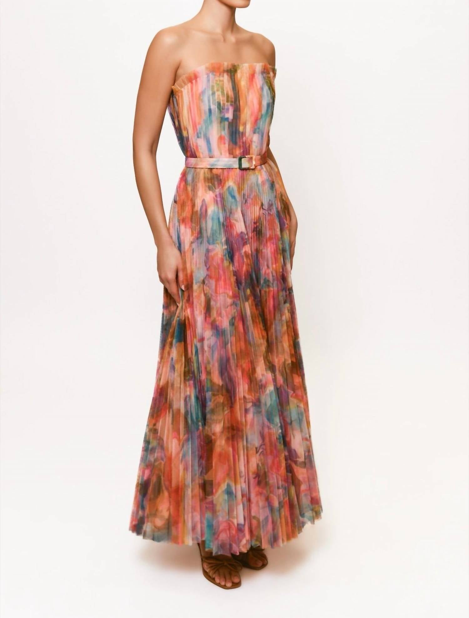 Who doesn't love a good maxi dress? This one you'll be reaching for season after season. Introducing the Bromley Gown by hutch, an elegant maxi dress in a captivating Watercolor Swirl design. This strapless piece features a sleek belted waist and an off-the-shoulder neckline, tailored to enhance your silhouette. With a graceful A-line silhouette and a flattering length of 55.5 inches, it's perfect for wedding occasions with a boho chic touch. Closure: Zip closure. Care: Dry clean only. Fabric: tulle.