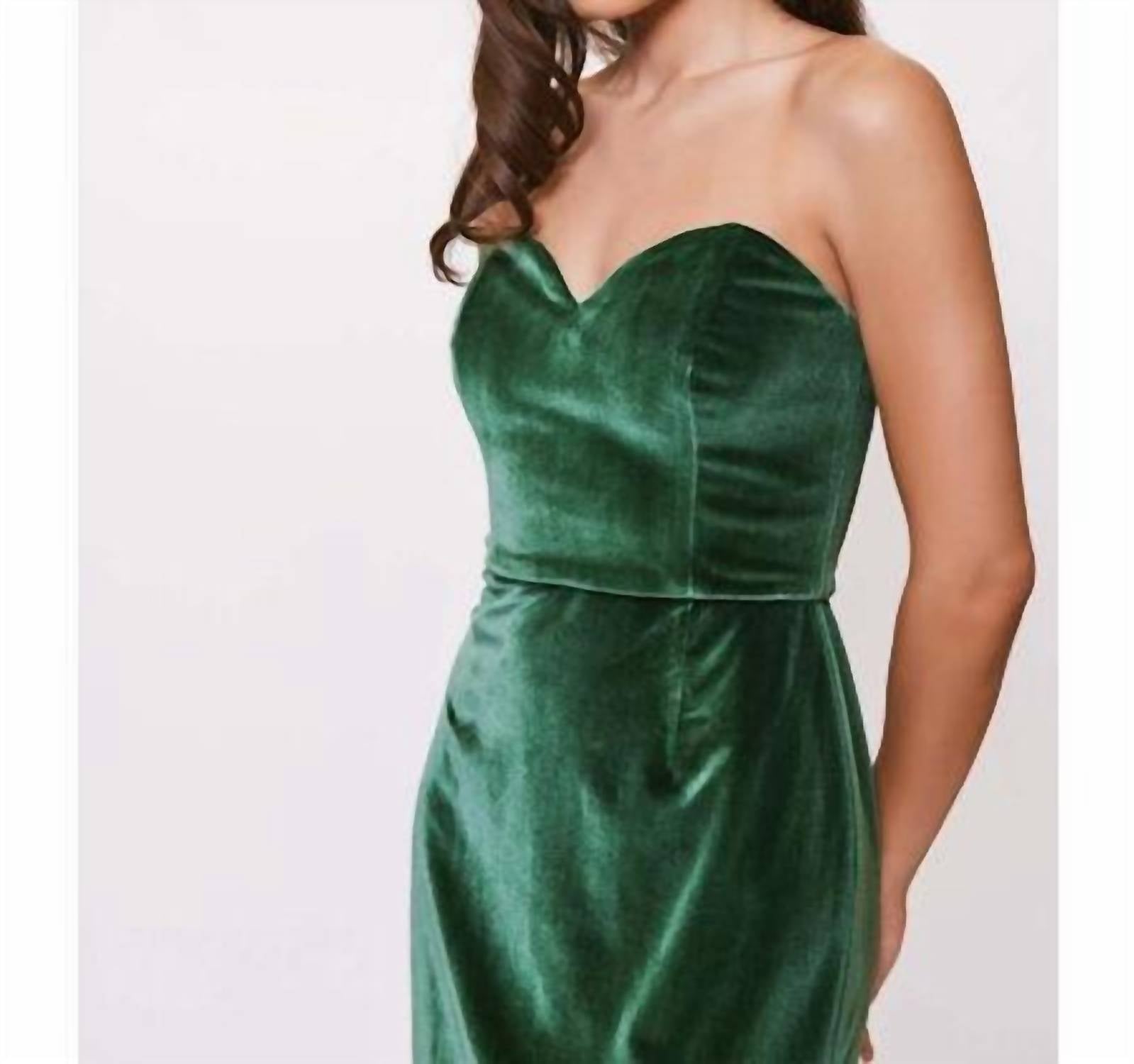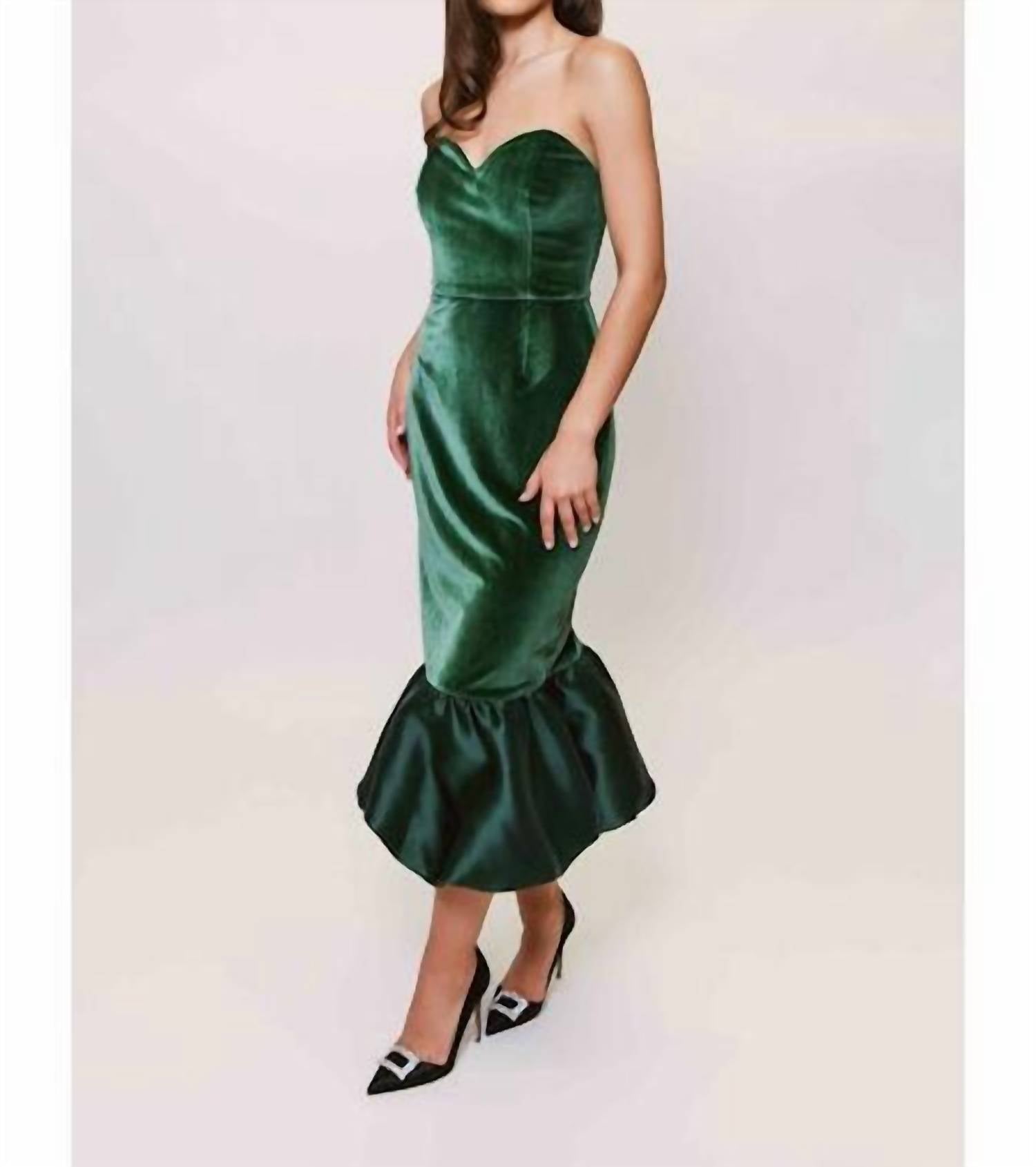 The pefect long sleeve dress for those cooler months. Introducing the Laken Strapless Midi Dress by Hutch, a stunning piece in rich emerald green designed to captivate. This strapless dress features a fitted silhouette with a sweetheart neckline, crafted from luxurious stretch velvet (92% polyester, 8% elastane) for a flattering fit. The midi length culminates in a voluminous bubble hem that adds a playful edge, while a back zipper closure ensures easy wear. Care: Dry clean only.