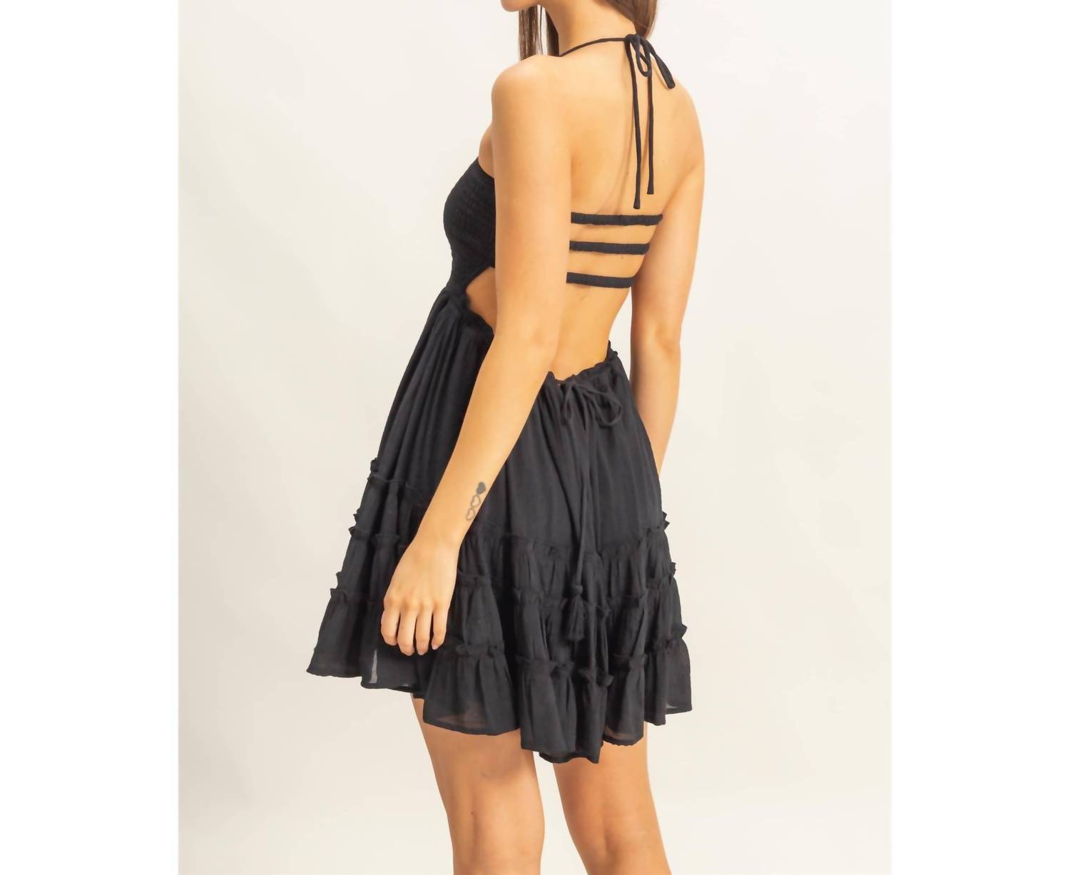 A short and breezy dress for those warmer days. Step into vacation mode with the Dakota Smocked Halter Neck Tiered Mini Dress by HYFVE. This sleeveless A-line dress in black features a solid pattern and tie closure at the back, exuding a maximalist trend. Made from 100% polyester, it boasts dainty shoulder straps forming a halter neckline, a smocked bodice, and a flowy tiered mini hem. Perfect for New Year's Eve celebrations or a dinner party, care for it with ease through machine wash.