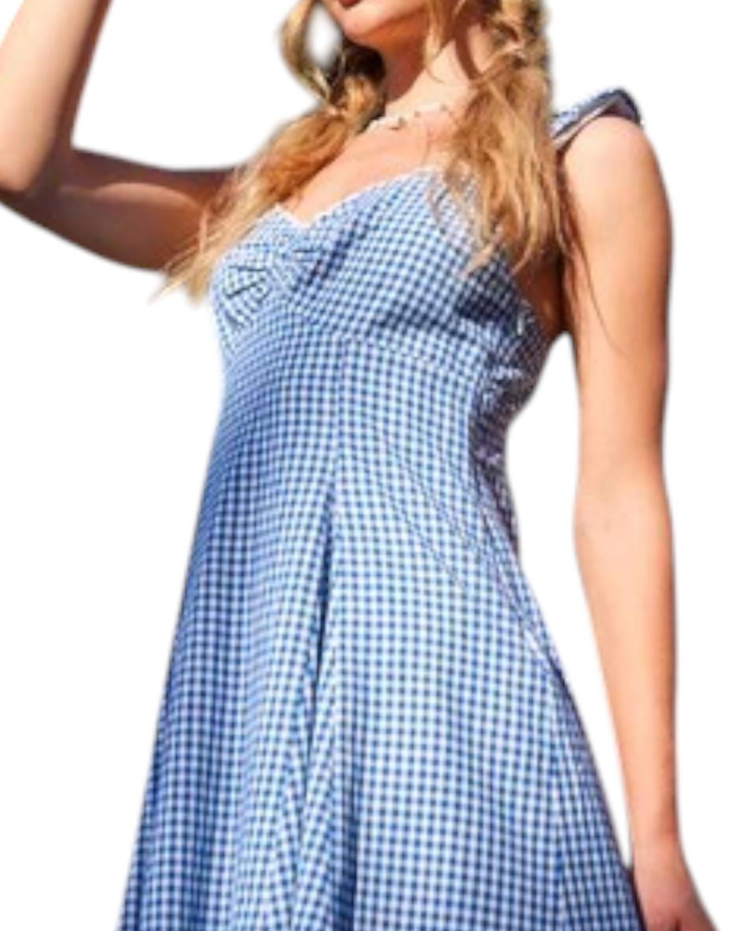 A short and breezy dress for those warmer days. The Picnic Chic Gingham Ribbon Mini Dress by Illa Illa is a perfect choice for a summer outing or vacation. This sleeveless mini dress in a playful blue gingham pattern features a flattering A-line silhouette enhanced by shirring and a pleated skirt. It is designed with a sweetheart neckline and includes lace trim and satin ribbon detailing for added charm. Closure: Zip closure.