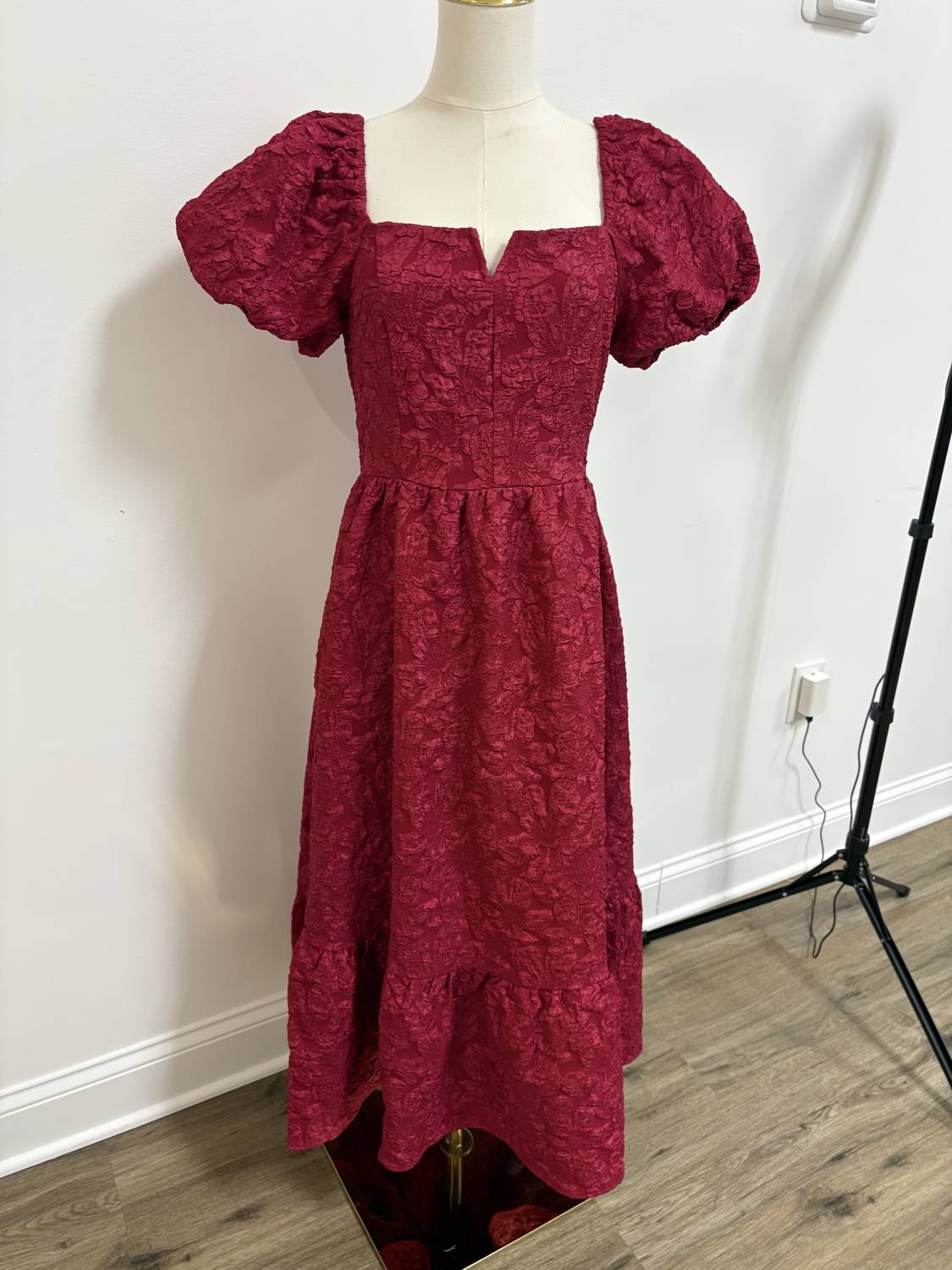 A midi dress so versatile, your options for wearing it are endless. Elevate your wardrobe with the Timeless Elegance Floral Jacquard Puff Sleeve Midi Dress by In February, a perfect blend of sophistication and charm for any special gathering. This burgundy A-line dress, adorned with a floral jacquard pattern, features short elasticized puff sleeves and a stretch smocked back for a flattering fit while maintaining comfort. Crafted from 98% polyester and 2% spandex, it boasts a pull-on closure and a slight V-neck detail, making it both stylish and easy to wear. Ideal for spring occasions, this dress is fully lined and true to size, with a small bust measurement of 32" and suited for those embracing the 90s fashion trend.
