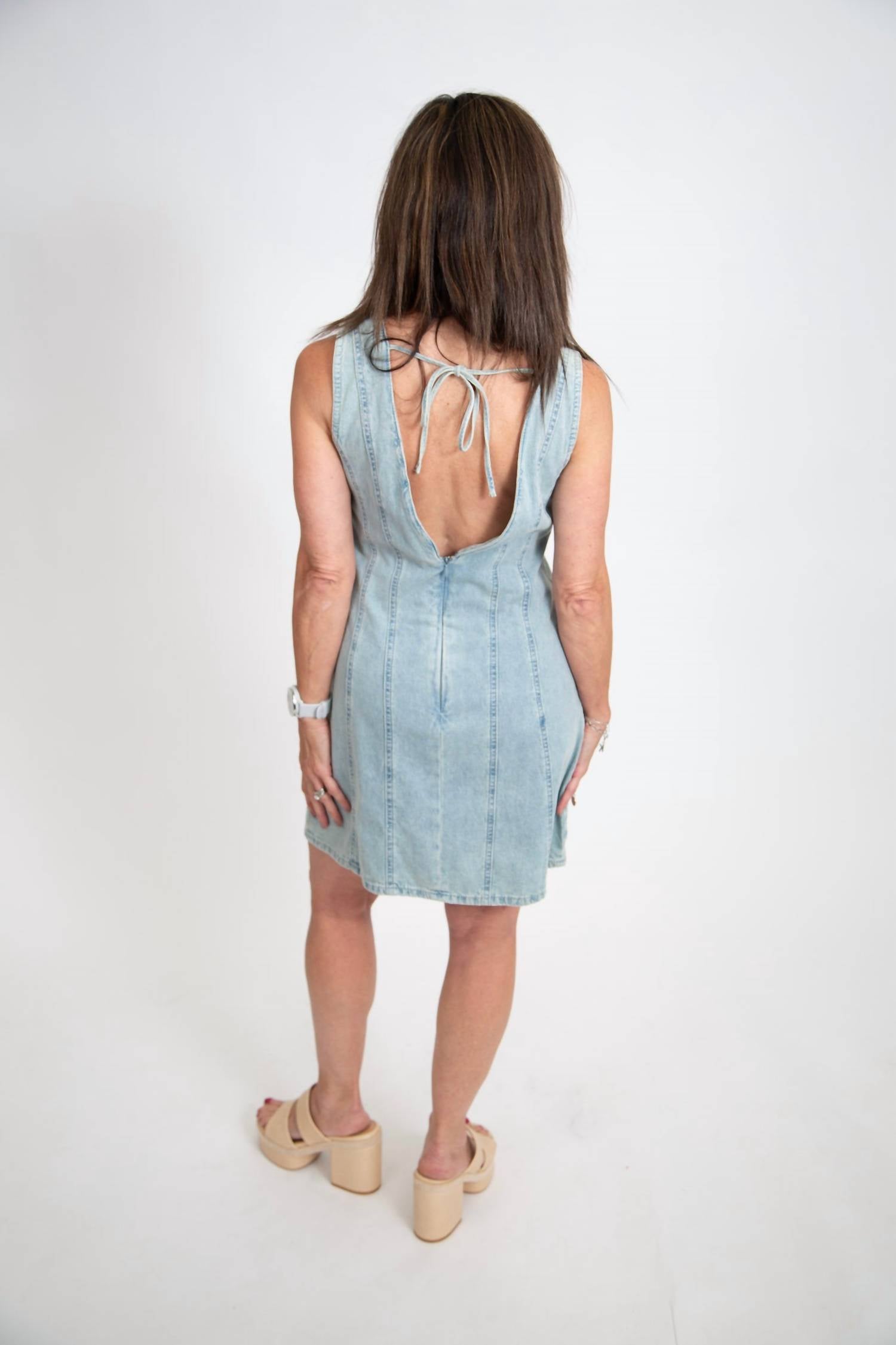 The perfect mini dress for those warmer months. Unveiling the V-neck Open Back Denim Mini Dress by In The Beginning, a stunning light denim piece ideal for summer festivities. This sleeveless dress boasts a flattering V-neckline with a fully lined design and features a back zipper closure complemented by a low back adjustable tie, creating a minimalist shift silhouette. Crafted from a cotton blend composed of 90% cotton and 10% polyester, it assures comfort and style. For lasting quality, hand wash with cold water and line dry. Available in size S (14.5” bust, 30.5” length), M (15.5” bust, 32” length), and L (16.5” bust, 32” length).