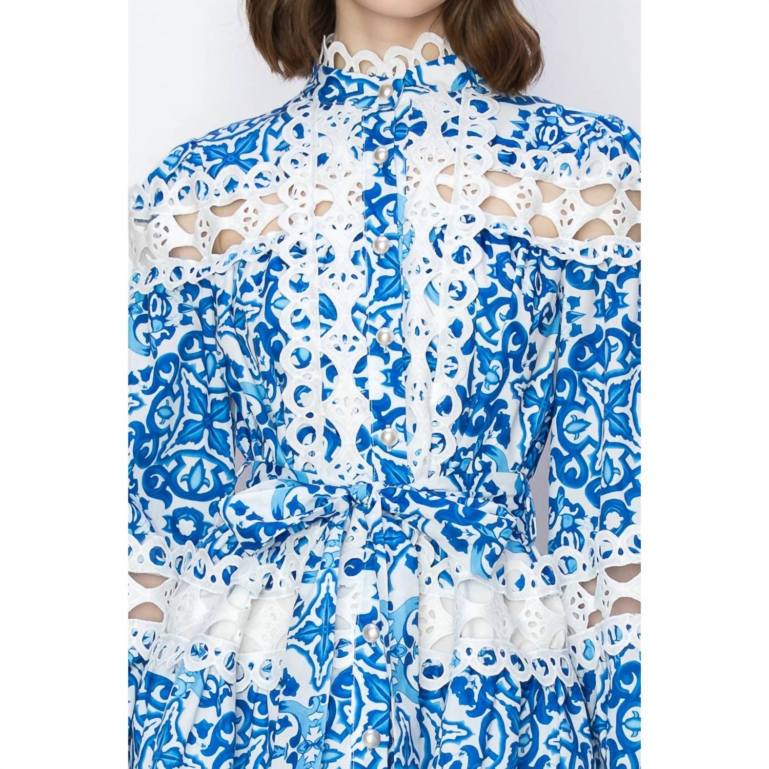 The perfect mini dress for those warmer months. Introducing the Crochet Lace Mini Dress by INA Fashion in a captivating Positano Blue. This women's dress features long sleeves and a mockneck, showcasing textured crochet lace that complements its charming A-line silhouette. The dress boasts front faux shell buttons and a self-tie belt, making it ideal for summer vacations or a boho chic outing. With a button closure, this mini dress perfectly blends elegance with a practical design for your wardrobe essentials.