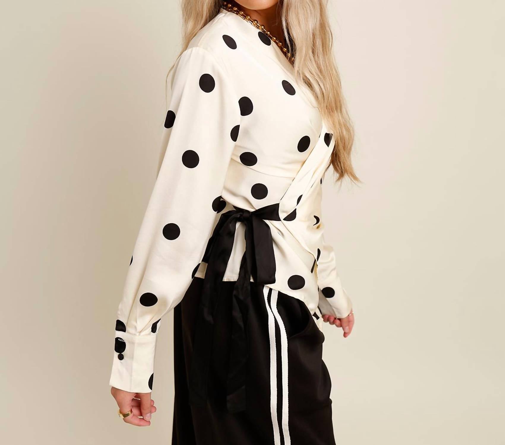 A versatile blouse that works from desk to dinner! Introducing the Spot On Wrap Long Sleeve Top by INA Fashion, a chic addition to your wardrobe with its playful polka dot print. Crafted from 100% polyester, this satin blouse features long buttoned sleeves and a stylish asymmetrical hemline. It boasts a wrap-front design with an elegant side tie and a flattering V-neckline, ensuring a sophisticated yet playful look. Closure: Tie closure. Care: Hand wash cold separately, hang to dry, no bleach. Model Kaylee is 5'7", 118 lbs with a 30" chest, 24" waist, and 35" hip, wearing a size small.