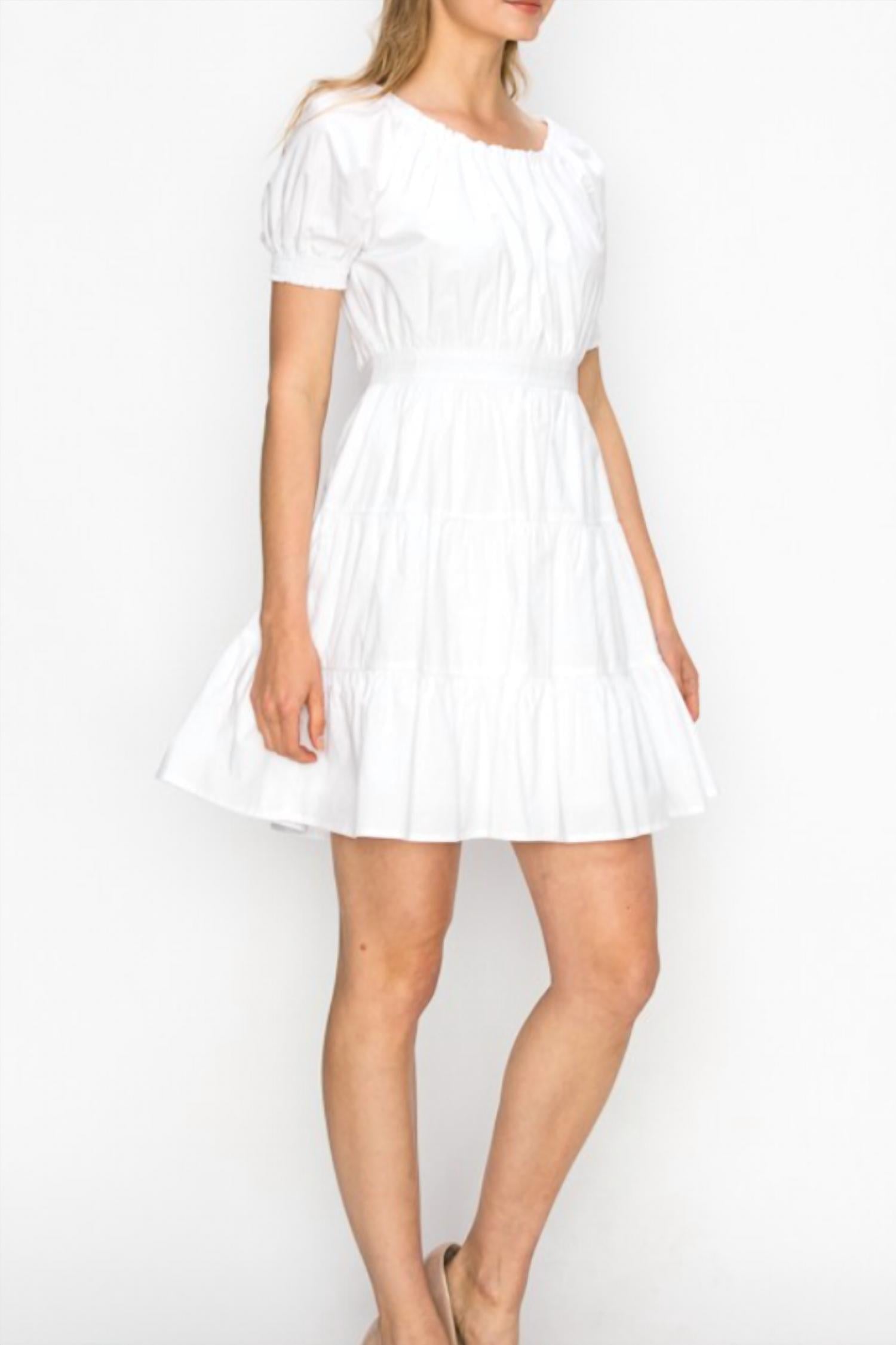The kind of easy and flattering dress you'll be reaching for all season long. Short sleeve tiered mini dress with smocking. Zipper closure and lined.