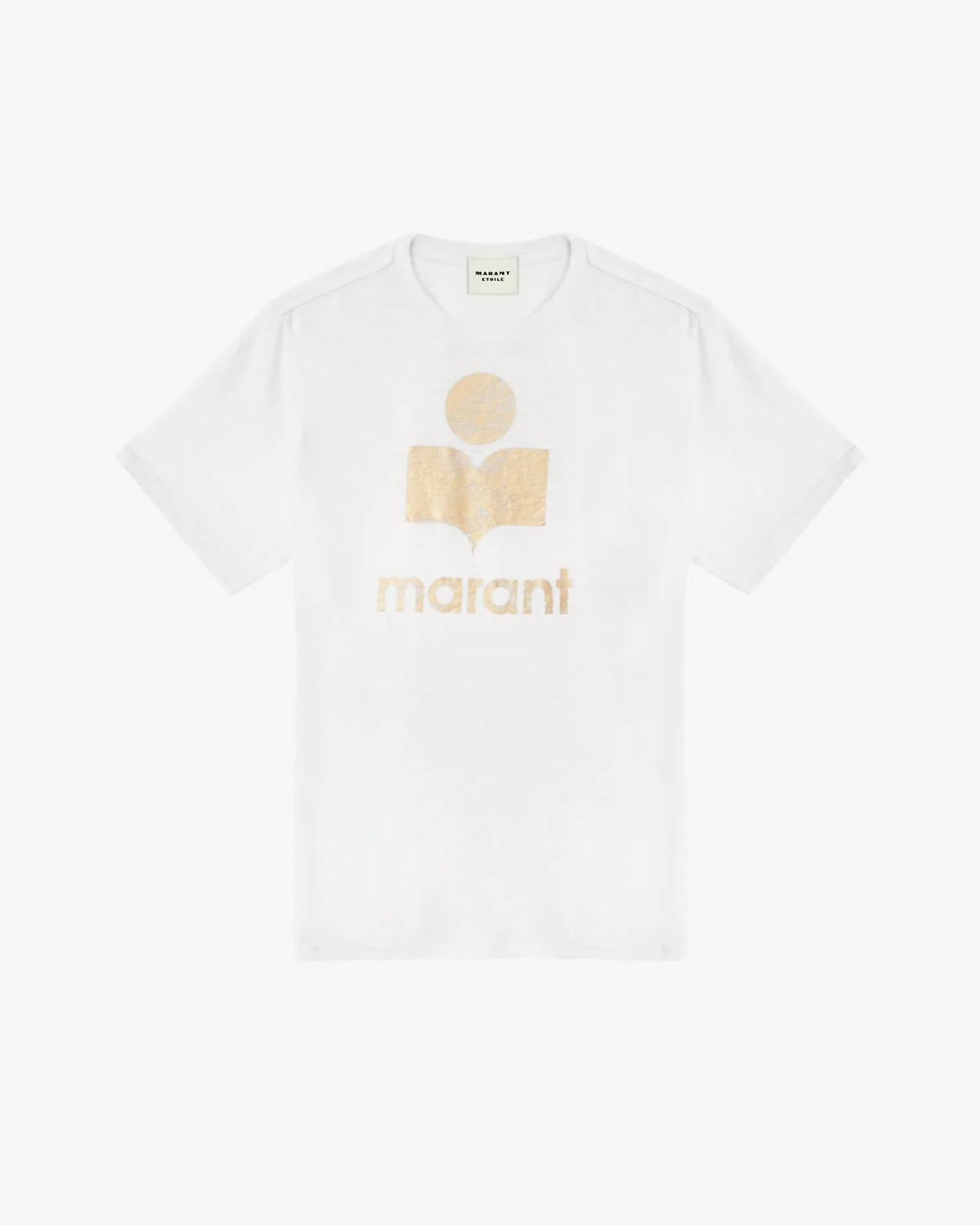 This classic, short sleeve tee will be your go-to staple this season and beyond. Embrace effortless chic with the Zewel Tee Shirt by ISABEL MARANT, an eco-friendly linen piece in a striking white/plum color. Designed with a relaxed fit and short sleeves, this graphic tee features a metallic "Marant" logo elegantly printed on the front. Material: 100% Linen. Closure: Pull on. Care instructions: Hand wash.