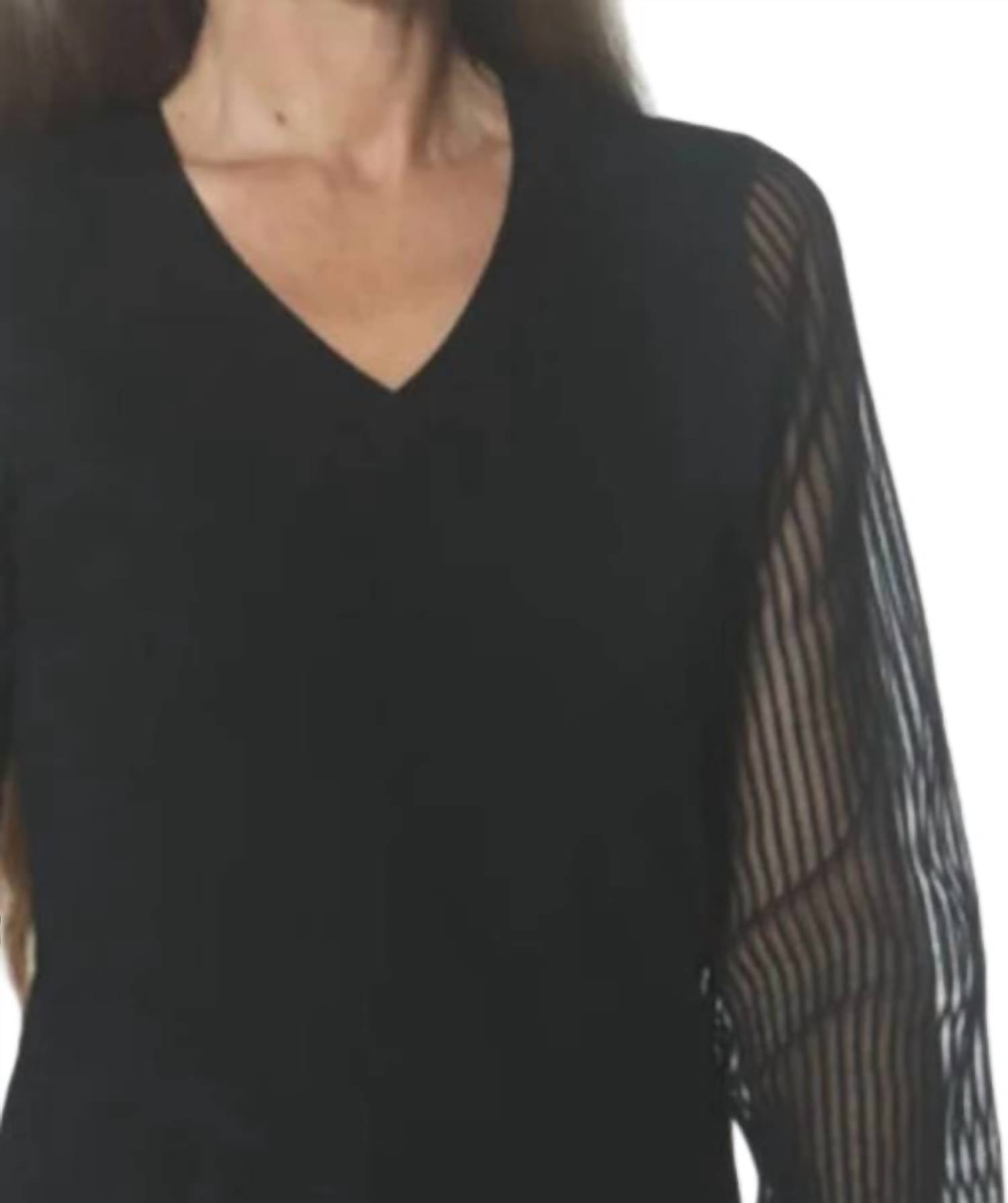 A timeless blouse that will never go out of style. The V-neck Sheer Sleeve Top by J'Envie/Eli is a refined choice for an elegant travel wardrobe. Crafted from a viscose blend, it features long sheer sleeves that add sophistication to the solid minimalist design in black. The pull-on closure design enhances ease of wear, while the flattering V-neckline beautifully frames the face. Care for this stylish piece by machine washing it cold.
