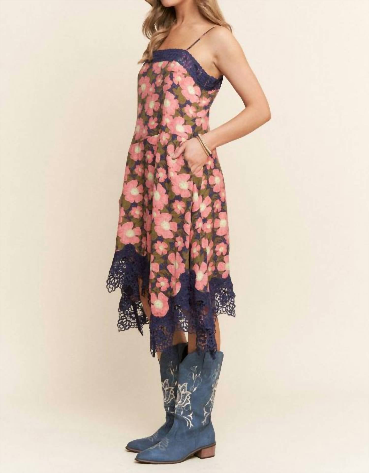A midi dress so versatile, your options for wearing it are endless. The Floral Print Lace Trim Midi Dress by J.NNA is a celebration of feminine charm in a vibrant Pink Multi hue. With spaghetti straps and delicate lace trim, this dress exudes effortless style. Designed in a slip silhouette with a squareneck, its pull-on closure ensures easy wear. Care instructions: Hand wash and line dry. Enjoy the flair of maximalist trends this summer, perfect for vacation outings.