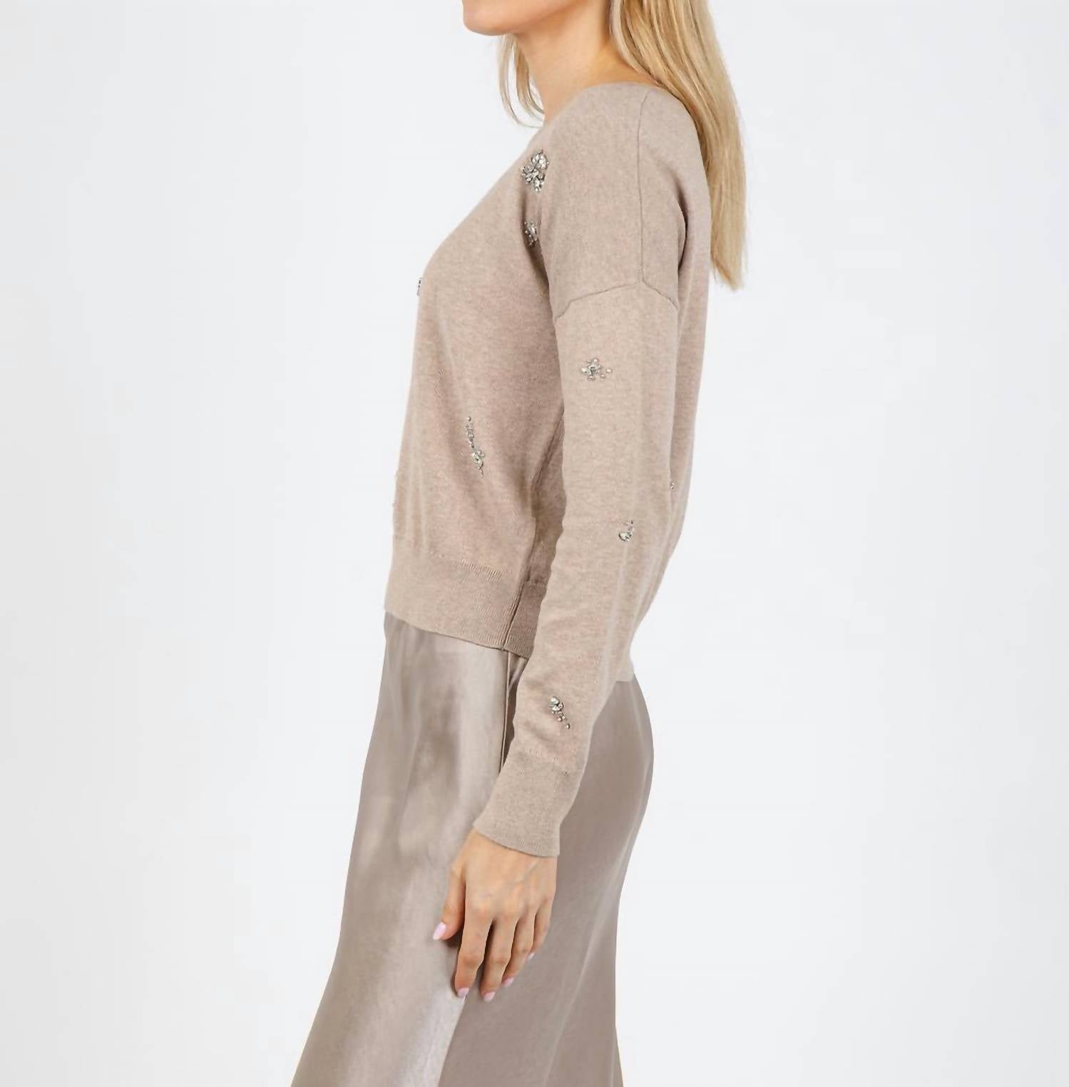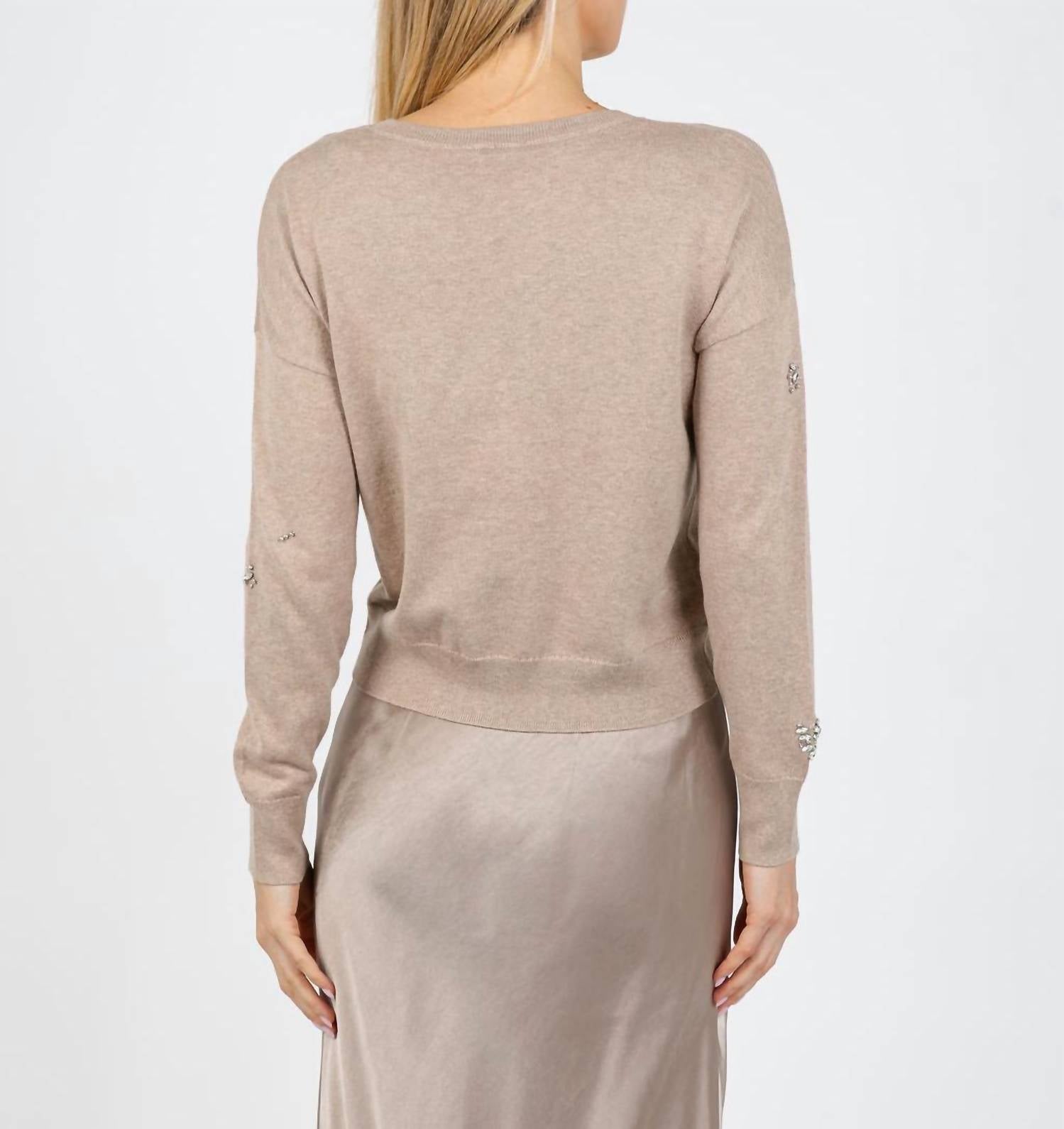 Experience the perfect blend of comfort and style with this trendy crew neck sweater, designed to effortlessly elevate your wardrobe. Pair it with your favorite denim and loafers for the perfect look. Elevate your knitwear collection with the J. Society Ariana Brooch Crew Sweater in a chic cappuccino shade. This women's sweater features long sleeves and a classic crew neckline, crafted from 100% cotton for a cozy fit. Intricately adorned with rhinestone brooch embellishments, it glamorously complements the textured pattern and relaxed silhouette. Closure: Pull on. Care: Machine wash. Model is wearing a size XS (5'8" height, 33" bust, 25" waist, 36" hips).