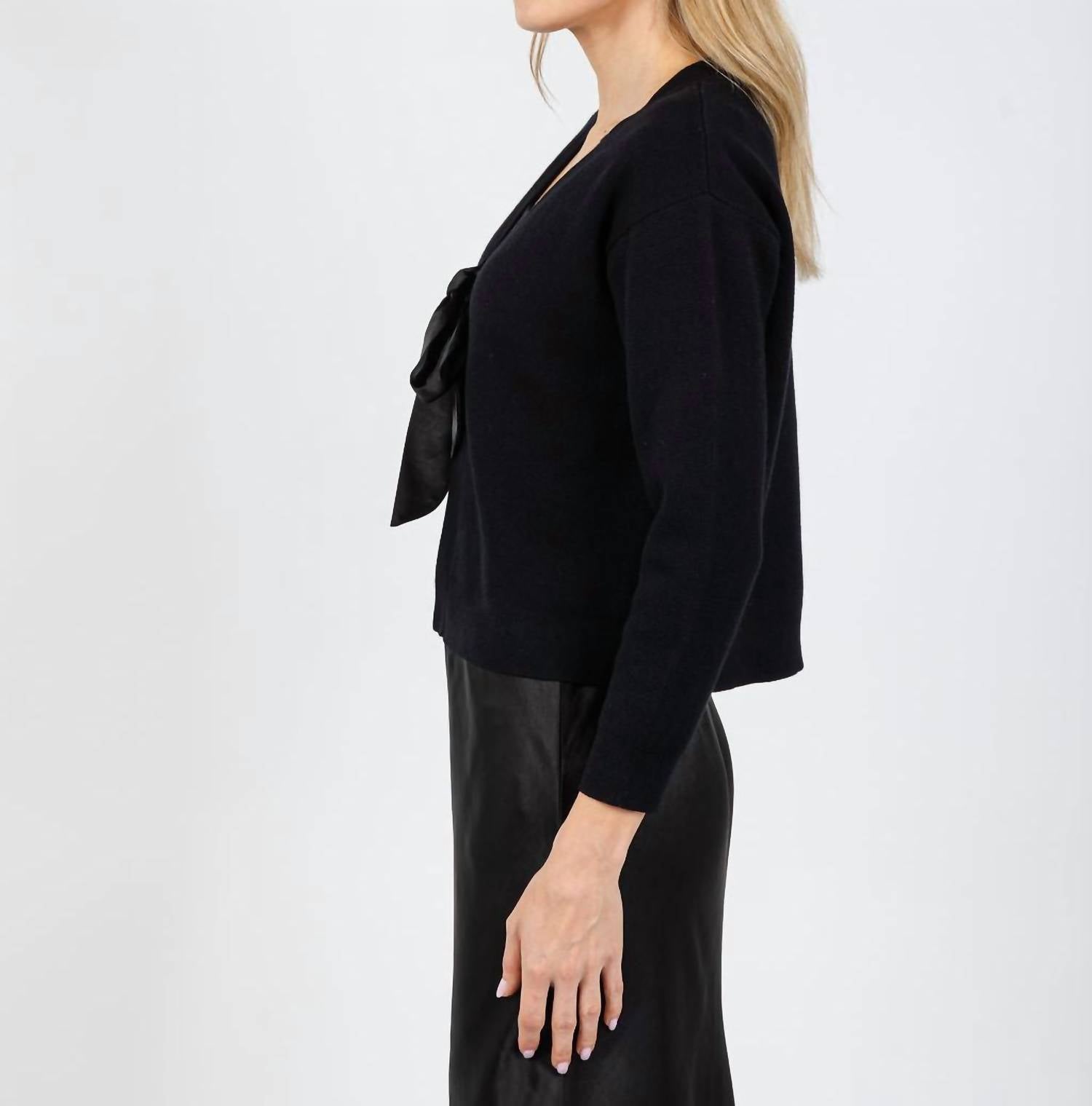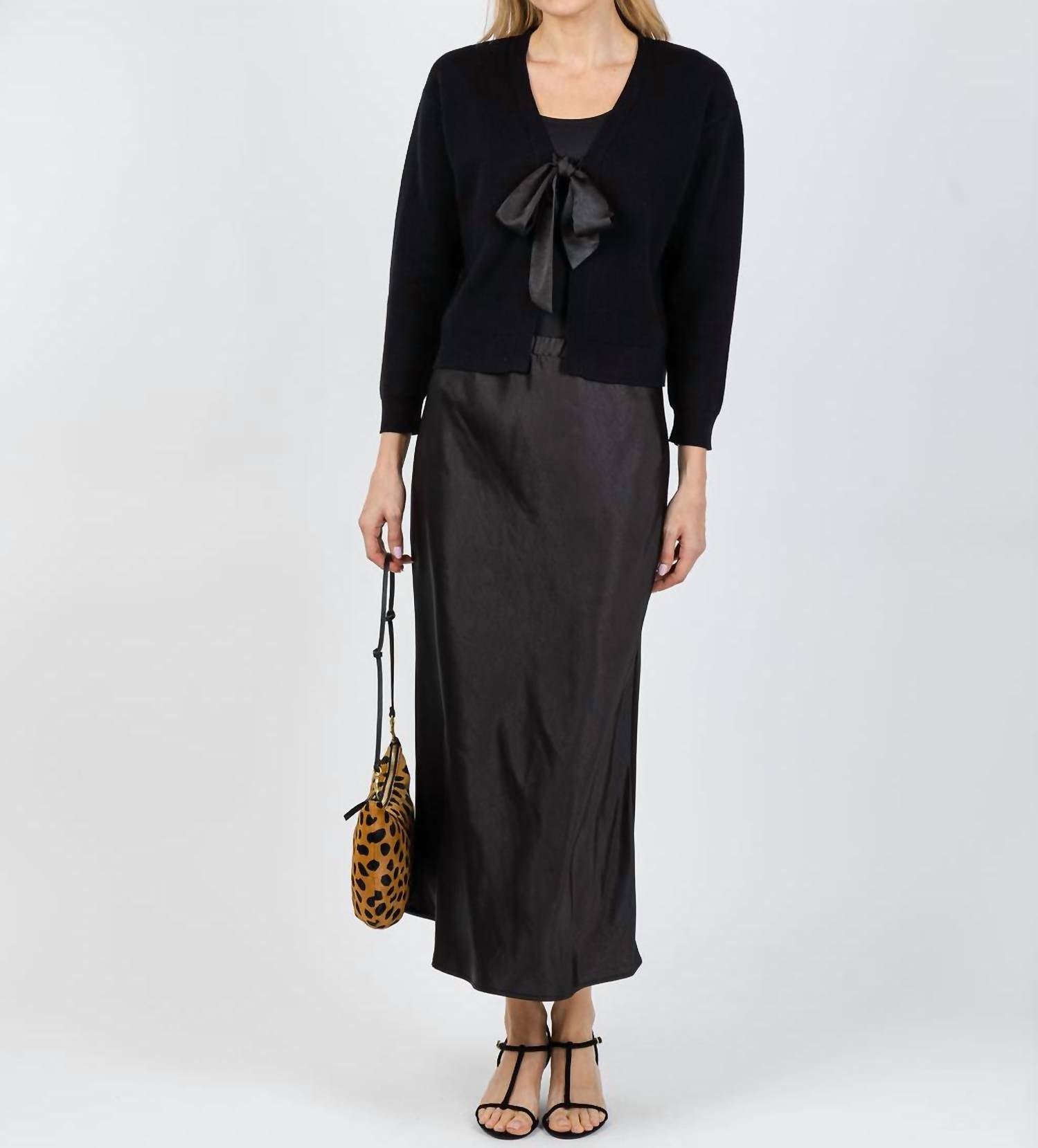 This cardigan will be a sweater-rotation favorite. Introducing the Maya Tie Front Cardigan by J. Society, a perfect blend of romance and versatility in timeless black. This cardigan features long sleeves and a V-neckline, complemented by an elegant satin ribbon tie closure for a chic finish. Crafted from a cotton blend, it effortlessly drapes over any ensemble, making it ideal for both casual and sophisticated occasions. Model Anna K is 5’8” and wearing a size XS, highlighting its relaxed yet flattering fit.