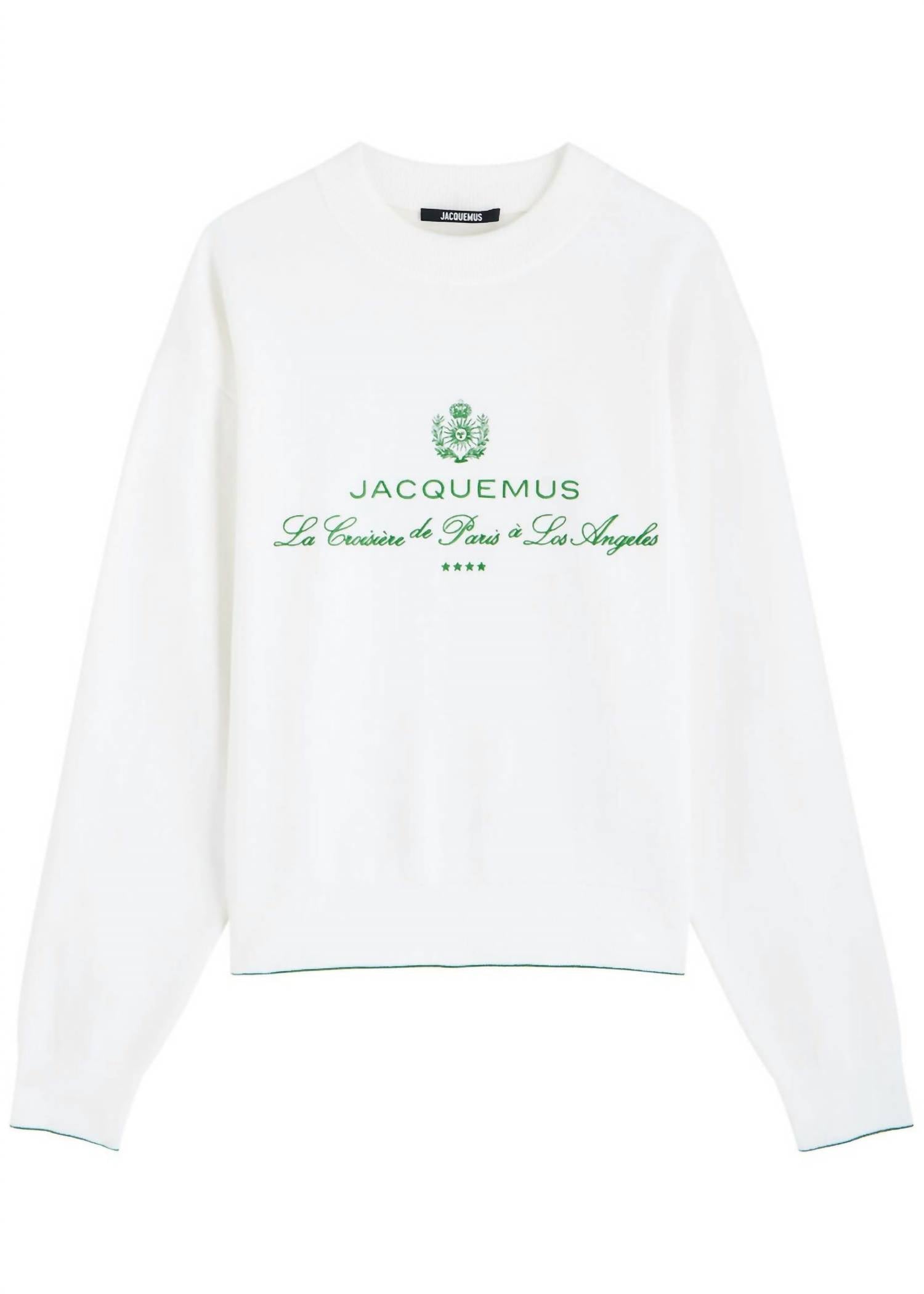 Experience the perfect blend of comfort and style with this trendy crew neck sweater, designed to effortlessly elevate your wardrobe. Pair it with your favorite denim and loafers for the perfect look. Introducing the La Maille Venice Sweater by Jacquemus, beautifully crafted for stylish modern women. This long sleeve, cotton-blend jumper features a classic crewneck design with dropped shoulders, finished with designer embroidery at the front and contrast stitching at the cuffs and hem. Composition: 52% Cotton, 34% Viscose, 13% Polyamide, 1% Elastane. Closure: Pull-on. Care: Machine wash.
