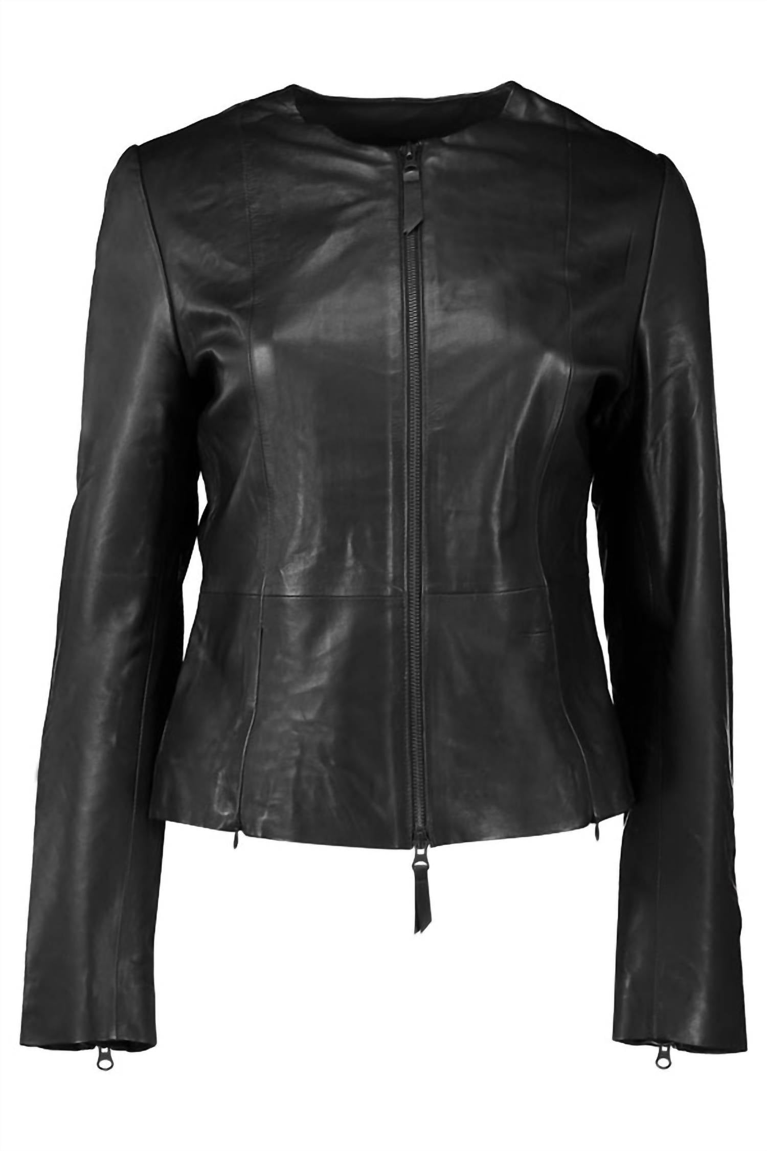 A leather jacket so good, it works with just about any outfit. Elevate your wardrobe with the Blair Convert Peplum Jacket by Jakett, an exquisite piece in Black Giacca Lusso perfect for sophisticated dinner parties. This long sleeve jacket is crafted from 100% genuine leather and features a unique double-sided center zipper along with four playful bottom zippers for a quirky touch. With its fully lined interior and minimalist design, this solid pattern piece offers a fitted silhouette adorned with distinctive zipper details. Closure: Zip closure. Care: Dry clean only.