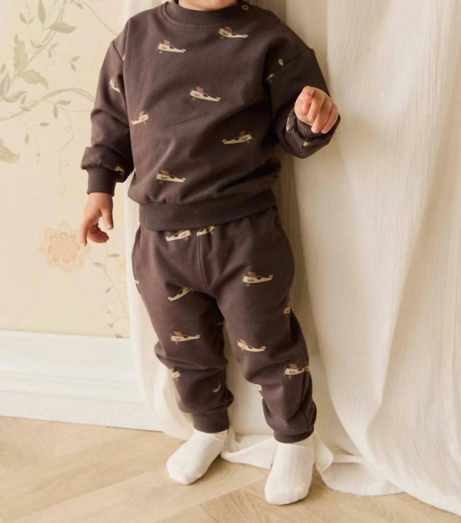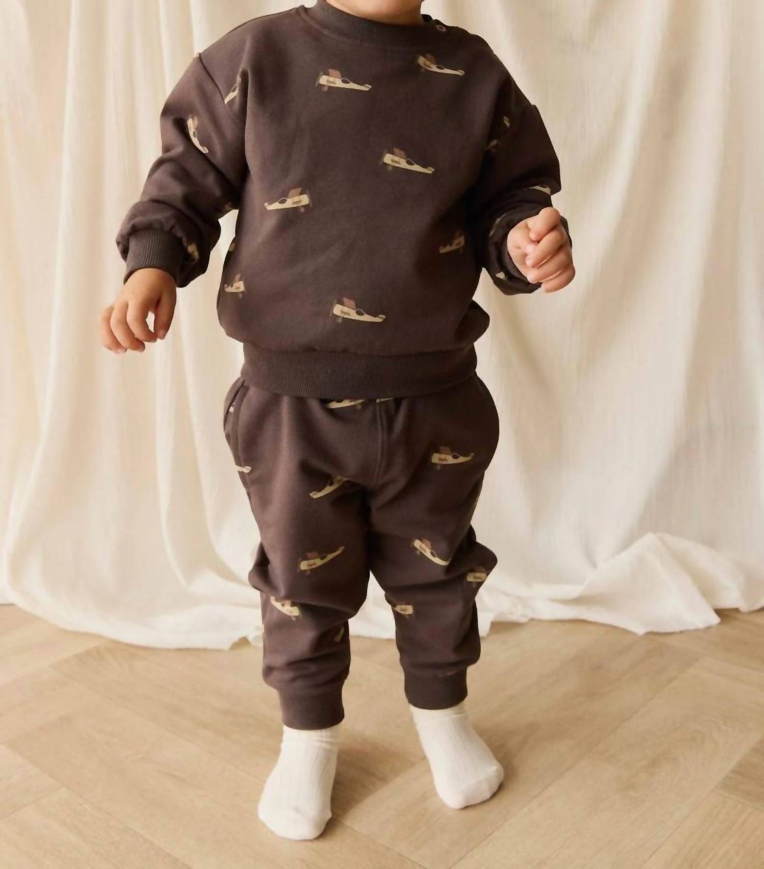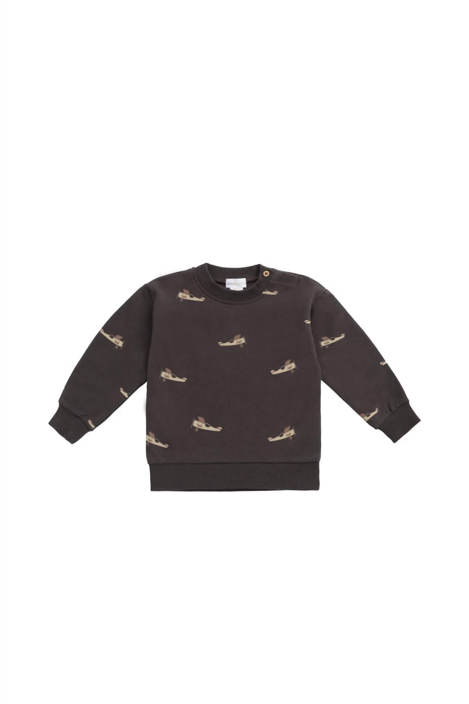 Introducing the Boys' Peyton Sweatshirt by Jamie Kay, a delightful addition to your child's wardrobe in the charming Pilot Planes Bistre. Featuring a graphic aeroplane print, this sweatshirt is crafted from 95% organic cotton and 5% elastane, providing both softness and stretch for active play. With convenient shoulder buttons on sizes up to 2 years, it ensures hassle-free dressing. Care: Cold gentle machine wash in a laundry bag, do not tumble dry.