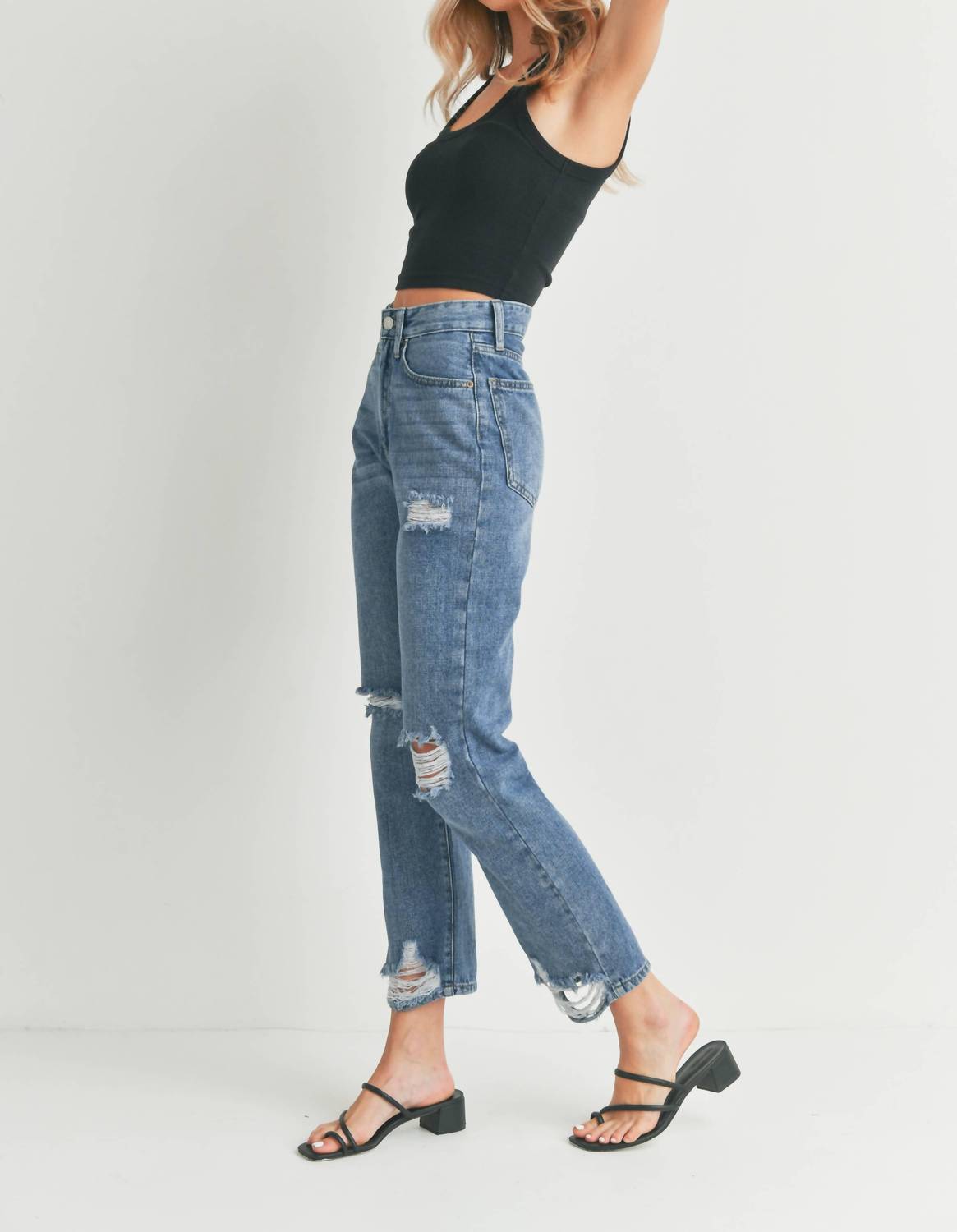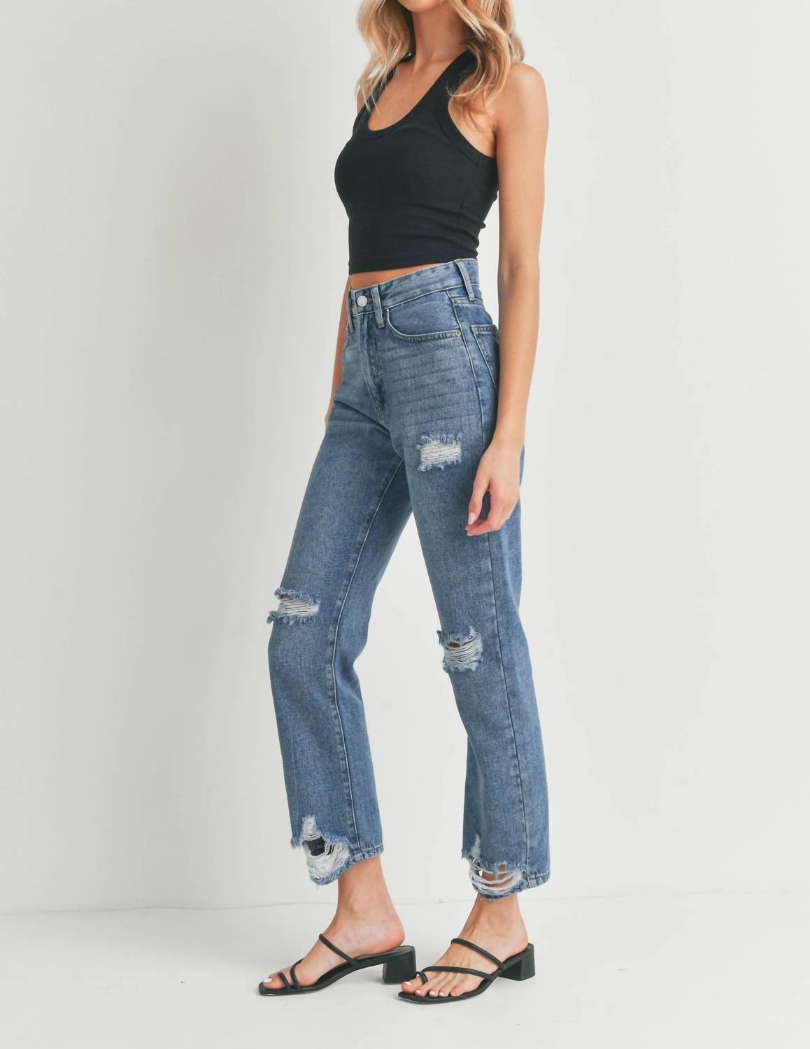 These must-have jeans are fit to perfection. Meet the Peyton High Rise Straight Leg Jeans by JBD, a must-have for any wardrobe. Crafted from non-stretch Medium Wash denim, these jeans feature a high-rise waist, relaxed fit, and straight leg style for a comfortable and trendy look. They come with artful distressing, a button closure, and functional pockets, adding that edgy touch to your outfit. With a rise of 11.5" and an inseam of 28.5", they are perfect for a streetwear-inspired style suitable for vacation or spring festivities. Care for these jeans with a machine wash and line dry method.
