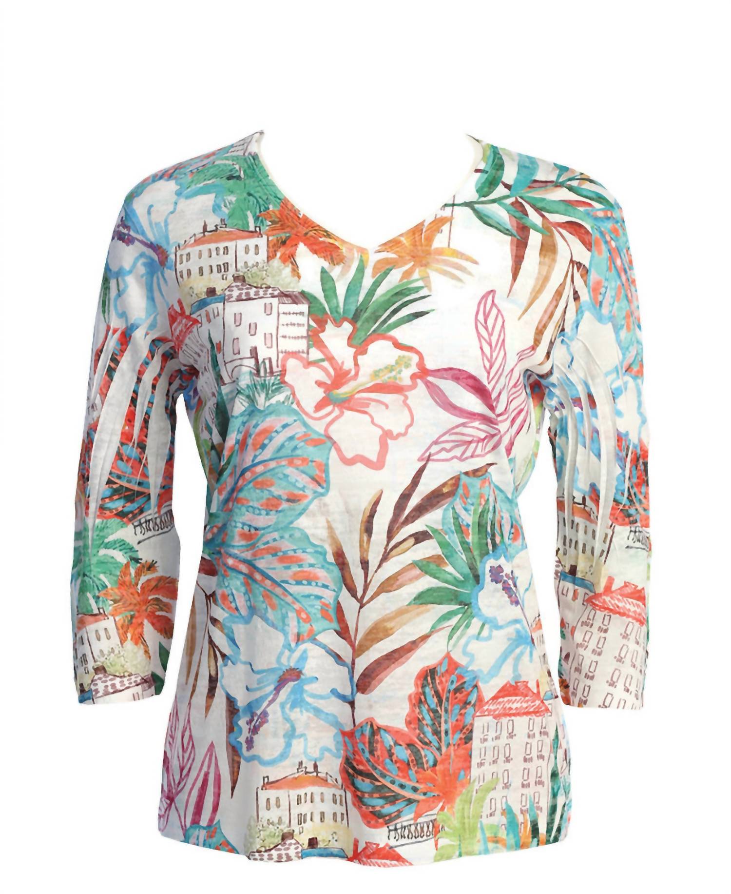 A versatile blouse that works from desk to dinner! The Women's Martinique Burnout Sublimation Top by Jess & Jane is a stylish and comfortable addition to any wardrobe, perfect for a summery day out or a casual vacation look. Featuring a V-neckline and three-quarter sleeves, this floral A-line shaped blouse is crafted from a lightweight blend of 50% cotton and 50% polyester. Made in the USA, it includes pre-washed and pre-shrunk fabric for ease of care, complemented by a convenient pull-on closure. Care instructions recommend a machine wash in cold water on a gentle cycle to maintain its boho chic vibrance.