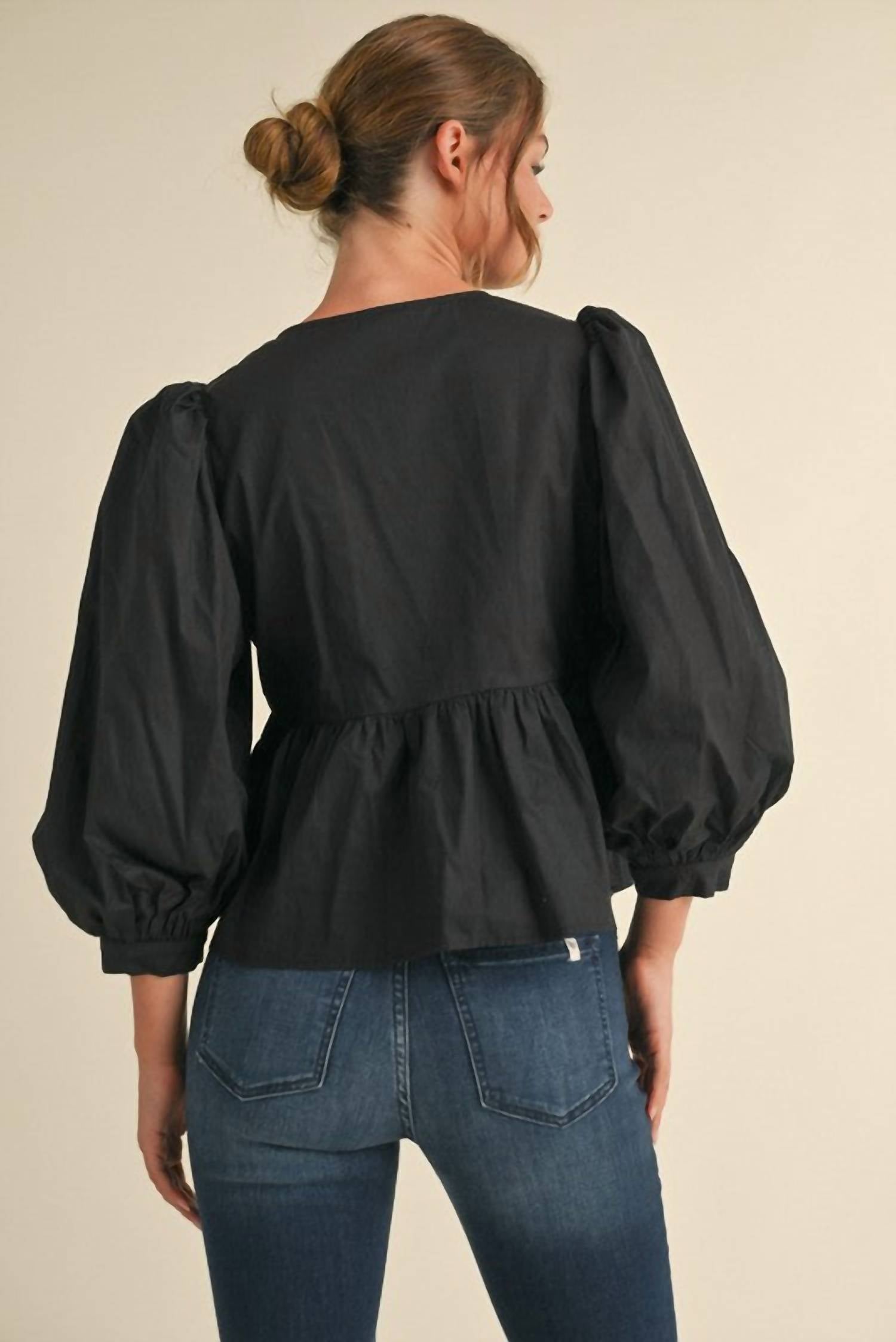 A timeless blouse that will never go out of style. Introducing the Betty Bow Ties Peplum Top by Jodifl, a sophisticated addition to your wardrobe in a solid black hue. This women's top features three-quarter sleeves, a crewneck, and charming bow tie details in a flattering peplum silhouette, perfect for holiday parties during the spring season. Material: Cotton. Closure: Tie closure.